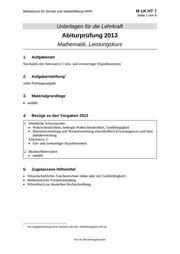 Ministerium für Schule und Weiterbildung NRW M LK HT 7 Seite 1 von 9 Unterlagen für die Lehrkraft Abiturprüfung 2013 Mathematik, Leistungskurs 1. Aufgabenart Stochastik mit Alternative 1 (ein- und zweiseitiger Hypothesentest) 2. 1 Aufgabenstellung siehe Prüfungsaufgabe 3. Materialgrundlage entfällt 4. Bezüge zu den Vorgaben 2013 1. Inhaltliche Schwerpunkte Wahrscheinlichkeit, bedingte Wahrscheinlichkeit, Unabhängigkeit Binomialverteilung und Normalverteilung einschließlich Erwartungswert und Stan- dardabweichung Alternative 1: Ein- und zweiseitiger Hypothesentest 2. Medien/Materialien entfällt 5. Zugelassene Hilfsmittel Wissenschaftlicher Taschenrechner (ohne oder mit Grafikfähigkeit) Mathematische Formelsammlung Wörterbuch zur deutschen Rechtschreibung 1 Die Aufgabenstellung deckt inhaltlich alle drei Anforderungsbereiche ab. Nur für den Dienstgebrauch!
