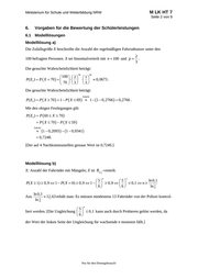 M LK HT 7 Ministerium für Schule und Weiterbildung NRW Seite 2 von 9 6. Vorgaben für die Bewertung der Schülerleistungen 6.1 Modelllösungen Modelllösung a) Die Zufallsgröße X beschreibe die Anzahl der regelmäßigen Fahrradnutzer unter den 2 100 befragten Personen. X sei binomialverteilt mit n 100 und p . 3 Die gesuchte Wahrscheinlichkeit beträgt: 70 30 100 2 1 P( E1 ) P X 70 0,0673 . 70 3 3 Die gesuchte Wahrscheinlichkeit beträgt: Tabelle P( E2 ) P X 70 1 P X 69 1 1 0,2766 0,2766 . Mit den obigen Festlegungen gilt: P( E3 ) P 60 X 70 P X 70 P X 59 Tabelle 1 0,2093 1 0,9341 0,7248. [Der auf 4 Nachkommastellen genaue Wert ist 0,7249.] Modelllösung b) X: Anzahl der Fahrräder mit Mängeln; X ist Bn, 1 -verteilt. 6 n n ln 0,1 5 5 P( X 1) 0,9 1 P( X 0) 0,9 1 0,9 0,1 n 5 ln 6 6 6 ln 0,1 Aus erhält man: Es müssen mindestens 13 Fahrräder von der Polizei kontrol- 12,63 5 ln 6 n 5 liert werden. [Die Ungleichung 0,1 kann auch durch Probieren gelöst werden, da 6 der Wert der linken Seite der Ungleichung für wachsende n monoton fällt.] Nur für den Dienstgebrauch!