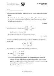 M GK HT 4 (GG) Seite 2 von 3 Name: _______________________ b) In einem Jahr wurden 60 Küken, 20 Jungvögel und 100 Altvögel im Beobachtungsgebiet gezählt. Ermitteln Sie die Anzahlen an Küken, Jungvögeln und Altvögeln im Beobachtungsgebiet im Jahr zuvor, wenn die angegebene Modellierung der Populationsentwicklung durch die Matrix A vorausgesetzt wird. (5 Punkte) x x c) (1) Bestimmen Sie x und y so, dass A 9 y 9 gilt. 30 30 [Zur Kontrolle: x 18 und y 1 .] (2) Interpretieren Sie den Sachverhalt aus c) (1) im Kontext. (6 + 3 Punkte) Veränderte Umweltbedingungen führen heute dazu, dass zur Modellierung jetzt die Matrix B gewählt wird: 0 0,7 0 B 0,6 0 0 . 0 0,75 0,8 d) (1) Vergleichen Sie die Matrizen A und B im Sachzusammenhang. 0,315 3 Es ist B 0 0,36 0,42 0,448 0,315 0,336 . 0,48 0,827 (2) Für eine Population wird vorausgesetzt, dass zu einem bestimmten Zeitpunkt die Anzahlen von Küken, Jungvögeln und Altvögeln übereinstimmen. Eine Forschungs- gruppe behauptet, dass in diesem Fall die Gesamtzahl der Tiere nach der Modellierung in einem Zeitraum von 3 Jahren um 20 % zunimmt. Beurteilen Sie die Aussage. Nur für den Dienstgebrauch!