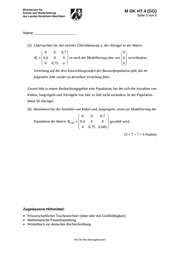 M GK HT 4 (GG) Seite 3 von 3 Name: _______________________ (3) Untersuchen Sie, bei welcher Überlebensrate u der Altvögel in der Matrix 0 0,7 0 Bu 0,6 0 0 es nach der Modellierung eine von 0 0,75 u 0 0 verschiedene 0 Verteilung auf die drei Entwicklungsstufen der Bussardpopulation gibt, die im folgenden Jahr wieder zu derselben Verteilung führt. Zurzeit lebt in einem Beobachtungsgebiet eine Population, bei der sich die Anzahlen von Küken, Jungvögeln und Altvögeln von Jahr zu Jahr nicht verändern. In der Population leben 50 Altvögel. (4) Bestimmen Sie die Anzahlen von Küken und Jungvögeln, wenn zur Modellierung der Population die Matrix B0,685 0 0,7 0 0,6 0 0 gewählt wird. 0 0,75 0,685 (3 + 7 + 7 + 4 Punkte) Zugelassene Hilfsmittel: Wissenschaftlicher Taschenrechner (ohne oder mit Grafikfähigkeit) Mathematische Formelsammlung Wörterbuch zur deutschen Rechtschreibung Nur für den Dienstgebrauch!