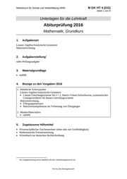 Ministerium für Schule und Weiterbildung NRW M GK HT 4 (GG) Seite 1 von 8 Unterlagen für die Lehrkraft Abiturprüfung 2016 Mathematik, Grundkurs 1. Aufgabenart Lineare Algebra/Analytische Geometrie Matrizenrechnung 2. 1 Aufgabenstellung siehe Prüfungsaufgabe 3. Materialgrundlage entfällt 4. Bezüge zu den Vorgaben 2016 1. Inhaltliche Schwerpunkte Lineare Algebra/Analytische Geometrie Lineare Gleichungssysteme für n > 2, Matrix-Vektor-Schreibweise, systematisches Lösungsverfahren für lineare Gleichungssysteme Matrizenrechnung Übergangsmatrizen Matrizenmultiplikation als Verkettung von Übergängen 2. Medien/Materialien entfällt 5. Zugelassene Hilfsmittel Wissenschaftlicher Taschenrechner (ohne oder mit Grafikfähigkeit) Mathematische Formelsammlung Wörterbuch zur deutschen Rechtschreibung 1 Die Aufgabenstellung deckt inhaltlich alle drei Anforderungsbereiche ab. Nur für den Dienstgebrauch!