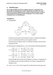 M GK HT 4 (GG) Ministerium für Schule und Weiterbildung NRW Seite 2 von 8 6. Modelllösungen Die jeweilige Modelllösung stellt eine mögliche Lösung bzw. Lösungsskizze dar. Der gewählte Lösungsansatz und -weg der Schülerinnen und Schüler muss nicht identisch mit dem der Modelllösung sein. Sachlich richtige Alternativen werden mit entsprechender Punktzahl bewertet (Bewertungsbogen: Zeile „Sachlich richtige Lösungsalternative zur Modelllösung“). Teilaufgabe a) (1) Übergangsgraph: 0 k 0,5 0 0 0,6 0 j 0 a 0,7 0,79 Der Matrixeintrag 0,6 gibt die durchschnittliche Anzahl von weiblichen Bussardküken an, die von einem Bussardweibchen pro Jahr ausgebrütet werden. Der Matrixeintrag 0,79 gibt den Anteil von (weiblichen) Altvögeln an, die das nächste Lebensjahr erreichen. (2) Berechnung der Verteilungsvektoren v1 und v2 für das nächste und das übernächste Jahr: 0 0, 6 30 18 18 30 0 v1 A 30 0, 5 0 0 30 15 15 , 30 0 0, 7 0, 79 30 44, 7 45 0 0, 6 18 27 27 18 0 v2 A 15 0, 5 0 0 15 9 9 . 45 0 0, 7 0, 79 45 46, 05 46 Nach dem Modell wird nach einem Jahr ein Bestand von 18 Küken, 15 Jungvögeln und 45 Altvögeln und nach zwei Jahren ein Bestand von 27 Küken, 9 Jungvögeln und 46 Altvögeln erreicht. (3) Anteil 0,5 0,7 0,79 0,2765 . Knapp 28 % der Küken leben drei Jahre später noch. Nur für den Dienstgebrauch!