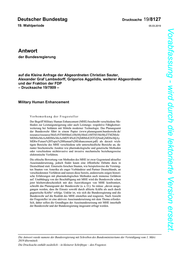 Deutscher Bundestag – 19. Wahlperiode –3– Drucksache 19/8127 Vorabfassung - wird durch die lektorierte Version ersetzt. 6. Welche Position zum Thema MHE vertritt die Bundesregierung innerhalb des transatlantischen Bündnisses und innerhalb der EU? Als Grundlage für eine noch zu bestimmende Position beteiligt sich Deutschland an den laufenden Diskussionen in der NATO und der EU. Bei diesen findet auch eine Befassung mit der gesellschaftlichen, ethischen, rechtlichen Bedeutung so- wie der zivilen und militärischen Nutzung von HPE statt. 7. Plant die Bundesregierung, Forschung im Bereich MHE zu fördern, oder för- dert sie diesen Bereich bereits? Wenn nein, warum nicht? Die Bundesregierung fördert Forschung im Bereich HPE zum einen in theoreti- schen Arbeiten. So wird die innerhalb der Kleinen Anfrage zitierte Studie des Planungsamts der Bundeswehr zum aktuellen Stand von Human Enhancement aus dem Jahr 2013 in Kooperation mit dem Vereinigten Königreich einer Aktua- lisierung unterzogen. Des Weiteren finden Betrachtungen innerhalb von Pro- grammen der wehrtechnischen Forschung und Technologie statt. 8. Wenn ja, welche Vorhaben werden innerhalb welcher Förderprogramme ge- fördert, und welche Haushaltsmittel werden jeweils aufgewendet (bitte Haushaltstitel angeben)? Die Antwort zu Frage 8 ist eingestuft als „VS – Nur für den Dienstgebrauch“ und erfolgt in der Anlage. Eine Veröffentlichung der in der Antwort zu Frage 8 ent- haltenen Daten würde einerseits durch Hinweise auf Forschungsprojekte der Bun- deswehr den strategischen Ansatz der Streitkräfte preisgeben und andererseits die * schützenwerten individuellen Firmen- und Auftragsinterna offenlegen. 9. Beabsichtigt die Bundesregierung, oder nach Kenntnis der Bundesregierung ein an PESCO (Ständige Strukturierte Zusammenarbeit) teilnehmender Mit- gliedstaat, Forschung im Bereich MHE als Projekt oder Teil eines Projektes innerhalb der Ständigen Strukturierten Zusammenarbeit vorzunehmen oder zu fördern? Derzeit existieren in der Ständigen Strukturierten Zusammenarbeit (PESCO) keine laufenden Projekte oder bekannten Projektabsichten im Bereich HPE. Zur Absicht anderer Staaten, Forschung bzw. Projekte im Bereich HPE innerhalb der Ständigen Strukturierten Zusammenarbeit einzubringen, liegen keine Erkennt- nisse vor. 10. Wie werden Soldaten der Bundeswehr derzeit auf die Möglichkeit vorberei- tet, dass sie in Einsätzen auf Parteien treffen könnten, bei denen Methoden des MHE angewendet werden? Im Rahmen der Einsatzvorbereitung werden Soldaten der Bundeswehr aktuell nicht auf die Möglichkeit vorbereitet, dass sie in Einsätzen auf Parteien treffen könnten, bei denen Methoden des HPE angewendet werden. * Das Bundesministerium der Verteidigung hat die Antwort als „VS – Nur für den Dienstgebrauch“ eingestuft. Die Antwort ist im Parla- mentssekretariat des Deutschen Bundestages hinterlegt und kann dort von Berechtigten eingesehen werden.