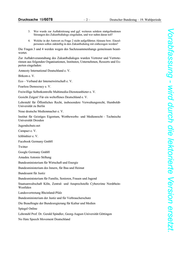 Drucksache 19/6078 –2– Deutscher Bundestag – 19. Wahlperiode Vorabfassung - wird durch die lektorierte Version ersetzt. 3. Wer wurde zur Auftaktsitzung und ggf. weiteren seitdem stattgefundenen Sitzungen des Zukunftsdialogs eingeladen, und wer nahm daran teil? 4. Welche in der Antwort zu Frage 2 nicht aufgeführten Akteure bzw. Einzel- personen sollen zukünftig in den Zukunftsdialog mit einbezogen werden? Die Fragen 3 und 4 werden wegen des Sachzusammenhangs gemeinsam beant- wortet. Zur Auftaktveranstaltung des Zukunftsdialoges wurden Vertreter und Vertrete- rinnen aus folgenden Organisationen, Instituten, Unternehmen, Ressorts und Ex- perten eingeladen: Amnesty International Deutschland e. V. Bitkom e. V. Eco – Verband der Internetwirtschaft e. V. Fearless Democracy e. V. Freiwillige Selbstkontrolle Multimedia-Diensteanbieter e. V. Gesicht Zeigen! Für ein weltoffenes Deutschland e. V. Lehrstuhl für Öffentliches Recht, insbesondere Verwaltungsrecht, Humboldt- Universität zu Berlin Neue deutsche Medienmacher e. V. Institut für Geistiges Eigentum, Wettbewerbs- und Medienrecht – Technische Universität Dresden Jugendschutz.net Campact e. V. Ichbinhier e. V. Facebook Germany GmbH Twitter Google Germany GmbH Amadeu Antonio Stiftung Bundesministerium für Wirtschaft und Energie Bundesministerium des Innern, für Bau und Heimat Bundesamt für Justiz Bundesministerium für Familie, Senioren, Frauen und Jugend Staatsanwaltschaft Köln, Zentral- und Ansprechstelle Cybercrime Nordrhein- Westfalen Landesvertretung Rheinland-Pfalz Bundesministerium der Justiz und für Verbraucherschutz Die Beauftragte der Bundesregierung für Kultur und Medien Spiegel Online Lehrstuhl Prof. Dr. Gerald Spindler, Georg-August-Universität Göttingen No Hate Speech Movement Deutschland