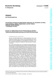 Deutscher Bundestag Drucksache 19/2306 19. Wahlperiode 24.05.2018 Vorabfassung - wird durch die lektorierte Version ersetzt. Antwort der Bundesregierung auf die Kleine Anfrage der Abgeordneten Katja Keul, Dr. Konstantin von Notz, Luise Amtsberg, weiterer Abgeordneter und der Fraktion BÜNDNIS 90/DIE GRÜNEN – Drucksache 19/1810 – Einsatz von Spähsoftware bei der Strafverfolgung (Quellen- Telekommunikationsüberwachung und Online-Durchsuchung) Vorbemerkung der Fragesteller Das Straf- und Strafverfahrensrecht als schärfster Eingriff des Staates in das Freiheitsrecht erfordert strikte Wahrung von Rechtsstaatlichkeit und Grund- rechten der Verfahrensbeteiligten wie aller Bürgerinnen und Bürger. Nur auf dieser Grundlage sind Effektivität, Praxistauglichkeit und Anpassung an mo- derne technische Möglichkeiten Maßstäbe der Modernisierung der Strafpro- zessordnung. Die von der Großen Koalition 2017 in die Strafprozessordnung (StPO) einge- fügte Regelung der Ermittlungsmaßnahmen Quellen-Telekommunikationsüber- wachung (TKÜ) und Online-Durchsuchung werden nach Ansicht von Rechts- wissenschaftlern und Sachverständigen für Informationstechnik den rechtsstaat- lichen und grundrechtlichen Herausforderungen der Digitalisierung nicht ge- recht und erscheinen bei Einhaltung der Vorgaben der StPO und des Grundge- setzes als praktisch unanwendbar (vgl. Buermeyer, Stellungnahme zur Anhö- rung des Ausschusses für Recht und Verbraucherschutz am 31. Mai 2017 (www. bundestag.de/ausschuesse/ausschuesse18/a06/anhoerungen/stellungnahmen/508 846), Stellungnahme Chaos Computer Club (Neumann, Kurz, Rieger) ebenda, Blechschmitt, Zur Einführung von Quellen-TKÜ und Online-Durchsuchung, Strafverteidiger-Forum 2017 S. 361-365, Stellungnahme Chaos Computer Club vom 4. Februar 2018 zur Anhörung im Innenausschuss des Hessischen Landtages, Ausschussvorlage INA 19/63 Teil 3, S 290 ff. (https://hessischer- landtag.de/content/innenausschuss-anh%C3%B6rung-zum-verfassungsschutz)). Denn bislang ist es offenbar weder dem eine Quellen-TKÜ oder Online-Durch- suchung anordnenden Gericht noch der die Maßnahme beantragenden oder bei Gefahr im Verzug zunächst entscheidenden Staatsanwaltschaft sowie der durch- führenden Behörde sicher möglich, sich Gewissheit über die Gesetzes- und Ver- fassungskonformität der für die informationstechnische Überwachung jeweils eingesetzten Software (im Folgenden abgekürzt: Spähsoftware) zu verschaffen. Sichere IT-Infrastrukturen und durchgehend hohe Verschlüsselungsstandards dürfen nicht gefährdet werden. Insbesondere nötig sind strikte Beachtung des Die Antwort wurde namens der Bundesregierung mit Schreiben des Bundesministeriums des Innern, für Bau und Heimat vom 18. Mai 2018 übermittelt. Die Drucksache enthält zusätzlich – in kleinerer Schrifttype – den Fragetext.