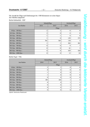 Deutscher Bundestag – 18. Wahlperiode – 11 – Drucksache 18/13587 Vorabfassung - wird durch die lektorierte Version ersetzt. Ankunft Jahr 2016 2015 Prozent Anteil Frachtflüge 0,3 0,3 (Quelle: Statistisches Bundesamt) 11. Wie viele Postflüge fanden nach Kenntnis der Bundesregierung jeweils in den Jahren 2015 und 2016 von und zu den beiden Berliner Flughäfen statt, und wie viele waren dies in Prozent aller Flüge von und zu den beiden Ber- liner Flughäfen (bitte Gesamtzahl der Flüge ebenfalls angeben)? 13. Wie groß war nach Kenntnis der Bundesregierung die Zahl der Postflüge von und zu den beiden Berliner Flughäfen bis zu einer Distanz von 1 000 km jeweils in den Jahren 2015 und 2016: a) absolut, b) in Prozent aller Postflüge (bitte Gesamtzahl der Postflüge angeben), und wie sind diese Flüge strukturiert nach Entfernung (in Schritten von je- weils 100 km) und unterteilt nach Inlands- und Auslandsflügen? Die Fragen 11 und 13 werden wegen ihres Sachzusammenhangs gemeinsam be- antwortet. Der Bundesregierung liegen aus der amtlichen Statistik keine Daten zu Postflügen von den und zu den Berliner Flughäfen vor. 12. Wie groß war nach Kenntnis der Bundesregierung die Zahl der Frachtflüge von und zu den beiden Berliner Flughäfen bis zu einer Distanz von 1 000 km jeweils in den Jahren 2015 und 2016: a) absolut, b) in Prozent aller Frachtflüge (bitte Gesamtzahl der Frachtflüge angeben), und wie sind diese Flüge strukturiert nach Entfernung (in Schritten von je- weils 100 km) und unterteilt nach Inlands- und Auslandsflügen? Im Jahr 2015 betrug die Anzahl der Frachtflüge vom und zum Flughafen Berlin- Schönefeld bis zu einer Distanz von 1 000 Kilometern insgesamt 2 065, im Jahr 2016 waren es 1 993. Die Anzahl der Frachtflüge vom und zum Flughafen Berlin-Tegel bis zu einer Distanz von 1 000 Kilometern betrug im Jahr 2015 insgesamt 453, im Jahr 2016 waren es 501. Im Jahr 2015 betrug die Gesamtzahl der Frachtflüge vom und zum Flughafen Berlin-Schönefeld 2 076, davon waren rund 99 Prozent kürzer als 1 000 Kilome- ter. Im Jahr 2016 waren es insgesamt 2 006 Flüge, davon waren ebenfalls rund 99 Prozent unter 1 000 Kilometer. Die Gesamtzahl der Passagierflüge vom und zum Flughafen Berlin-Tegel betrug im Jahr 2015 458, davon waren rund 99 Prozent kürzer als 1 000 Kilometer. Im Jahr 2016 waren es insgesamt 508 Flüge, davon waren ebenfalls rund 99 Prozent unter 1 000 Kilometer.