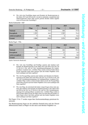 Deutscher Bundestag – 18. Wahlperiode – 13 – Drucksache 18/13587 Vorabfassung - wird durch die lektorierte Version ersetzt. 14. Wie viele reine Frachtflüge gingen nach Kenntnis der Bundesregierung in den Jahren 2015 und 2016 jeweils von und zu nationalen, europäischen und außereuropäischen Zielen (bitte jeweils getrennt absolute Zahlen angeben sowie in Prozent aller Frachtflüge)? Berlin-Schönefeld - SXF Ziele 2016 2015 Flüge Prozent Flüge Prozent National 708 35,3 569 27,4 Europäisch 1.293 64,5 1.503 72,4 Außereuropäisch 5 0,2 4 0,2 Gesamt 2.006 100,0 2.076 100,0 Berlin-Tegel – TXL Ziele 2016 2015 Flüge Prozent Flüge Prozent National 497 97,8 446 97,4 Europäisch 9 1,8 12 2,6 Außereuropäisch 2 0,4 0 0,0 Gesamt 508 100,0 458 100,0 (Quelle: Statistisches Bundesamt) 15. Wie viele reine Frachtflüge und Postflüge starteten oder landeten nach Kenntnis der Bundesregierung in den Jahren 2015 und 2016 in der Zeit von 23 Uhr bis 6 Uhr, und wie viele Ausnahmegenehmigungen für Landun- gen/Starts verspäteter bzw. verfrühter Flüge wurden in diesen beiden Jahren jeweils insgesamt erteilt (bitte getrennt nach den beiden Flughäfen sowie nach Landungen und Starts angeben)? 16. Wie viele Passagierflüge starteten oder landeten nach Kenntnis der Bundes- regierung in den Jahren 2015 und 2016 in der Zeit von 23 Uhr bis 6 Uhr, und wie viele Ausnahmegenehmigungen für Landungen/Starts verspäteter bzw. verfrühter Flüge wurden in diesen beiden Jahren jeweils für Passagierflüge erteilt (bitte getrennt nach den beiden Flughäfen sowie nach Landungen und Starts angeben)? 17. Wie viele Flüge, die nicht durch die beiden vorigen Fragen erfasst sind, star- teten oder landeten nach Kenntnis der Bundesregierung in den Jahren 2015 und 2016 in der Zeit von 23 Uhr bis 6 Uhr, und wie viele Ausnahmegeneh- migungen für Landungen/Starts verspäteter bzw. verfrühter Flüge wurden in diesen beiden Jahren jeweils für Flüge erteilt, die nicht durch die beiden vo- rigen Fragen erfasst sind (bitte getrennt nach den beiden Flughäfen sowie nach Landungen und Starts angeben)? Die Fragen 15 bis 17 werden wegen ihres Sachzusammenhangs gemeinsam be- antwortet. Der Bundesregierung liegen aus der amtlichen Statistik keine nach der Uhrzeit differenzierten Daten zu Flügen von den und zu den Berliner Flughäfen vor.