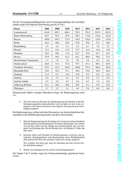Deutscher Bundestag – 18. Wahlperiode –5– Drucksache 18/11738 Vorabfassung - wird durch die lektorierte Version ersetzt. Für die Kommunen ergibt sich folgende Entwicklung (jeweils in Tsd.): Jahr Aktive VE 2006 184,2 106,9 2007 184,0 108,1 2008 184,8 108,2 2009 185,5 109,4 2010 186,1 110,2 2011 186,2 111,2 2012 186,3 112,5 2013 186,5 114,1 2014 186,1 115,8 2015 186,1 118,7 Für die Sozialversicherung ergibt sich folgende Entwicklung (entsprechend der statistischen Angaben sind bei den aktiven Beamtinnen und Beamten auch die Betriebskrankenkassen berücksichtigt) (jeweils in Tsd.): Jahr Aktive VE 2006 39,7 17,4 2007 38,7 18,4 2008 37,0 18,9 2009 36,2 19,2 2010 35,5 19,7 2011 35,6 20 2012 34,6 20,6 2013 33,9 20,8 2014 33,0 21,3 2015 32,1 22 4. Wie viele Beihilfeberechtigte haben nach Kenntnis der Bundesregierung ei- nen Beihilfeanspruch, weil sie als Ehegatte oder Kind eines Beihilfeberech- tigten berücksichtigungsfähig sind (bitte getrennt nach Ehegatten und Kin- dern angeben)? Zur Anzahl der berücksichtigungsfähigen Personen nach § 80 Absatz 2 BBG lie- gen der Bundesregierung keine Daten vor. 5. Wie hat sich nach Kenntnis der Bundesregierung die Zahl der Versorgungs- empfängerinnen und Versorgungsempfänger in den vergangenen zehn Jah- ren entwickelt (bitte getrennt für Bund, die einzelnen Länder und sonstige angeben)? In Bezug auf den Bund wird auf die Antwort zu Frage 3 verwiesen.