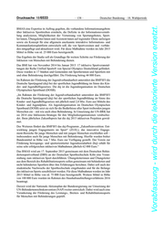Drucksache 18/6533 – 138 – Deutscher Bundestag – 18. Wahlperiode Vorabfassung - wird durch die lektorierte Version ersetzt. BMAS eine Expertise in Auftrag gegeben, die vorhandene Informationsangebote über Inklusives Sporttreiben ermitteln, die Defizite in der Informationsvermitt- lung analysieren, Möglichkeiten der Vernetzung von Sportangeboten, Sport- ler/innen, Übungsleiter/innen und Assistent/innen auf regionaler Ebene aufzeigen sowie ein Konzept für eine allgemein anerkannte interaktive Informations- und Kommunikationsplattform entwickeln soll, die von Sportvereinen und -verbän- den mitgepflegt und aktualisiert wird. Für diese Maßnahme werden im Jahr 2015 Mittel in Höhe von rd. 25 000 Euro bereitgestellt. Das Ergebnis der Studie soll als Grundlage für weitere Schritte zur Förderung der Inklusion von Menschen mit Behinderung dienen. Das BMI hat von November 2014 bis Januar 2015 17 inklusive Sportveranstal- tungen der Reihe Unified Sports® von Special Olympics Deutschland gefördert. Diese wurden in 17 Städten und Gemeinden mit Sportlerinnen und Sportlern mit und ohne Behinderung durchgeführt. Die Förderung betrug 44 000 Euro. Im Rahmen der Förderung der Jugendverbandsarbeit unterstützt das BMFSFJ die Deutsche Sportjugend (dsj) bei der sportlichen Jugendbildung im Sinne des Kin- der- und Jugendhilfegesetzes. Die dsj ist die Jugendorganisation im Deutschen Olympischen Sportbund (DOSB). „Im Rahmen der Förderung der Jugendverbandsarbeit unterstützt das BMFSFJ die Deutsche Sportjugend (dsj) bei der sportlichen Jugendbildung im Sinne des Kinder- und Jugendhilfegesetzes mit jährlich rund 2,8 Mio. Euro aus Mitteln des Kinder- und Jugendplans. Als Jugendorganisation im Deutschen Olympischen Sportbund (DOSB) setzt sie sich für die Bedürfnisse aller Sport treibenden jungen Menschen ein – mit wie auch ohne Behinderung. In Umsetzung der UN-BRK hat sie 2014 eine Inklusions-Strategie für ihre Mitgliedsorganisationen verabschie- det. Ihren jährlichen Zukunftspreis hat die dsj 2015 inklusiven Projekten gewid- met. Des Weiteren fördert das BMFSFJ das dsj-Programm „Zukunftsinvestition: Ent- wicklung jungen Engagements im Sport“ (ZI:EL), das innovative Engage- ment-Bereiche für junge Menschen und mit jungen Menschen erschließen soll – insbesondere auch für junge Menschen mit Behinderung. Hierfür wurden bisher Bundesmittel in Höhe von 7 Mio. Euro zur Verfügung gestellt. Der Verein zur Förderung bewegungs- und sportorientierter Jugendsozialarbeit (bsj) erhält für seine sehr erfolgreichen inklusiven Maßnahmen jährlich 62 000 Euro.“ Das BMAS wird am 17. September 2015 gemeinsam mit dem Deutschen Behin- dertensportverband (DBS) an der Deutschen Sporthochschule Köln eine Veran- staltung zum inklusiven Sport durchführen. Übungsleiterinnen und Übungsleiter aus dem Bereich des Rehabilitationssports sollen gemeinsam mit behinderten und nicht behinderten Sportlern über ihre Erfahrungen berichten. Dabei soll auch der studentische Nachwuchs der Sporthochschule eingebunden und für die Belange des inklusiven Sports sensibilisiert werden. Für diese Maßnahmen werden im Jahr 2015 Mittel in Höhe von rd. 75 000 Euro bereitgestellt. Weitere Mittel in Höhe von 100 000 Euro wurden im Rahmen des Haushaltsaufstellungsverfahrens 2016 beantragt. Derzeit wird der Nationale Aktionsplan der Bundesregierung zur Umsetzung der UN-Behindertenrechtskonvention (NAP) weiter entwickelt. Dabei wird auch eine Verankerung der Förderung des Leistungs-, Breiten- und Rehabilitationssports für Menschen mit Behinderungen geprüft.