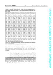 Deutscher Bundestag – 18. Wahlperiode – 43 – Drucksache 18/6533 Vorabfassung - wird durch die lektorierte Version ersetzt. 2011 durchschnittlich bei 2,5 Prozent, stieg 2012 und 2013 auf 2,8 Prozent und lag 2014 bei 2,7 Prozent. Spitzenreiter sind die Bundesländer Berlin (um 5 Pro- zent), Bremen (zwischen 3,4 Prozent in 2011 und 6,5 Prozent in 2012) und Nie- dersachsen (um 4 Prozent). Am unteren Ende liegen Baden-Württemberg, Bayern und Brandenburg. Tabelle 1: Inklusionsquote der Kinder* mit besonderem Förderbedarf in Kinder- tageseinrichtungen** Land 2010 2011 2012 2013 2014 BW 1,1 1,1 1,8 1,4 1,4 BY 1,4 1,4 1,2 1,5 1,5 BE 5,2 5,3 5,3 5,0 5,0 BB 1,9 1,8 2,7 2,6 2,2 HB 5,0 3,4 6,5 5,3 4,9 HH 3,0 2,7 3,1 2,8 2,8 HE 2,2 2,2 2,4 2,3 2,2 MV 3,1 3,2 3,5 3,6 3,3 NI 4,0 4,0 4,2 4,0 3,8 NW 2,8 3,0 3,3 3,3 3,3 RP 2,1 1,8 2,4 2,2 1,8 SL 2,7 2,5 4,6 4,2 3,3 SN 2,8 2,8 2,9 3,0 2,8 ST 2,3 2,4 2,7 2,5 2,4 SH 3,8 3,5 4,4 4,3 3,7 TH 3,0 2,9 2,8 3,0 3,0 D 2,5 2,5 2,8 2,8 2,7 * ohne Schulkinder ** nur Kindertageseinrichtungen im Sinne des SGB VIII Quelle: Statistisches Bundesamt, Statistik der Kinder- und Jugendhilfe, Kinder und tätige Personen in öf- fentlich geförderter Kindertagespflege, Berechnungen der Dortmunder Arbeitsstelle Kinder- und Jugend- hilfestatistik Für den Schulbereich kann die Entwicklung der Inklusionsquote von 2003 bis 2013 der beigefügten Tabelle 2 entnommen werden. In Deutschland hat sich die durchschnittliche Inklusionsquote im Schulbereich im Zeitraum von 2003 bis 2013 verdreifacht. Den höchsten Anstieg weist Hamburg mit 4,17 Prozentpunk- ten, den geringsten Bremen mit 0,39 Prozentpunkten aus. Bezüglich der Unter- schiede im Ländervergleich wird auf den Bericht „Bildung in Deutschland 2014“ der Autorengruppe Bildungsberichterstattung, S. 178 ff, verwiesen, der das Thema „Bildung von Menschen mit Behinderung“ als Schwerpunkt behandelt.