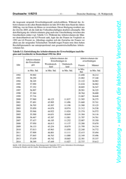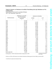 Drucksache 18/6215 –6– Deutscher Bundestag – 18. Wahlperiode Vorabfassung - wird durch die lektorierte Version ersetzt. 8. Zu welchem Anteil geht der Abbau der Arbeitslosigkeit insgesamt bzw. in einzelne Phasen auf die demografische Entwicklung, Abwanderung und vor- ruhestandsähnliche Regelungen zurück (bitte mit konkreten Zahlen oder Schätzungen beantworten)? Der Bundesregierung liegen keine konkreten Zahlen bzw. Schätzungen vor, in welchem Maße jeweils die demografische Entwicklung, Abwanderung und vor- ruhestandsähnliche Regelungen den Abbau der Arbeitslosigkeit beeinflussen. Sofern man unter vorruhestandsähnlichen Regelungen allein die Inanspruch- nahme des § 428 SGB III durch Arbeitslosengeldempfänger, die das 58. Lebens- jahr vollendet haben, Leistungen unter erleichterten Voraussetzungen beziehen können und in dieser Zeit nicht als arbeitslos gezählt werden, sowie die Inan- spruchnahme paralleler Regelungen im SGB II (§ 65 Absatz 4 SGB II) und im SGB VI (§ 252 Absatz 8 SGB VI) versteht, zeigen Zusammenstellungen des IAB, das die Gesamtzahl der Personen, die in Ostdeutschland unter diese Regelungen fielen, bis zum Jahr 2008 auf rund 160 000 angewachsen und danach bis 2014 auf rund 60 000 zurück gegangen ist. Die Regelungen sind Ende 2007 ausgelaufen; eine spätere Inanspruchnahme war noch möglich, wenn der Anspruch vor dem 1. Januar 2008 entstanden ist und der Arbeitslose vor diesem Tag das 58. Lebensjahr vollendet hatte. 9. Wie hat sich seit dem Jahr 1990 bis heute die Abwanderung aus den ostdeut- schen Bundesländern entwickelt (bitte jährliche Zahlen nennen), und um welche Altersgruppen handelt es sich vorrangig? Die gewünschten Daten können der Tabelle 9 entnommen werden. Für 2014 lie- gen bisher keine nach Alter aufgeschlüsselten Ergebnisse vor. Nach vorläufigen Werten des Statistischen Bundesamts sind 2014 per Saldo rund 3 300 Personen von den ost- in die westdeutschen Bundesländer abgewandert. Tabelle 9: Wanderungssalden (Zu- minus Fortzüge zwischen den neuen Ländern (ohne Berlin) und den alten Ländern (ohne Berlin) nach Altersgruppen Insgesamt unter 18 18 - u. 25 25 - u. 30 30 - u. 50 50 - u. 65 65 u. ä. 1991 -165.390 -48.271 -53.664 -21.298 -31.669 -7.442 -3.046 1992 -90.337 -33.131 -20.836 -7.906 -18.991 -6.708 -2.765 1993 -55.580 -22.613 -12.303 -1.693 -10.808 -5.314 -2.849 1994 -34.494 -15.840 -10.198 1.294 -4.402 -3.379 -1.969 1995 -31.892 -12.566 -12.398 468 -3.958 -2.359 -1.079 1996 -24.929 -7.447 -13.812 -1.461 -1.783 -782 356 1997 -28.202 -6.491 -15.622 -3.163 -4.027 -389 1.490 1998 -46.265 -9.696 -20.522 -6.425 -10.497 -566 1.441 1999 -58.134 -10.989 -25.115 -8.530 -14.247 -675 1.422 2000 -75.951 -12.982 -32.401 -11.221 -19.960 -1.082 1.695 2001 -97.565 -17.303 -38.098 -14.282 -27.957 -1.591 1.666 2002 -80.827 -10.649 -33.431 -14.999 -22.001 -1.524 1.777 2003 -58.352 -7.142 -28.255 -10.564 -13.523 -191 1.323 2004 -51.675 -4.886 -27.920 -10.377 -9.954 111 1.351 2005 -48.976 -3.991 -25.345 -11.072 -9.419 -83 934 2006 -54.144 -5.300 -25.393 -12.521 -10.789 -578 437 2007 -54.805 -5.513 -23.990 -13.236 -11.601 -911 446 2008 -51.007 -4.678 -21.728 -13.069 -11.012 -998 478