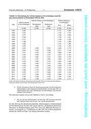 Deutscher Bundestag – 18. Wahlperiode –3– Drucksache 18/6215 Vorabfassung - wird durch die lektorierte Version ersetzt. lag die Quote in Ostdeutschland bei 75,3 Prozent und in Westdeutschland bei 69,5 Prozent. Die Erwerbsquote bezieht die Erwerbspersonen auf die Bevölke- rung im Alter von 15 bis unter 65 Jahren. Informationen zu den anderen Jahren sind der Tabelle 3.1 im Anhang zu entnehmen. Die Beschäftigungsquote lag 2014 nach Ergebnissen der Beschäftigungsstatistik der Bundesagentur für Arbeit in Ostdeutschland bei 56,8 Prozent gegenüber 55,6 Prozent in Westdeutschland. 1999 lag die Quote in Ostdeutschland bei 49,1 Prozent und in Westdeutschland bei 48,2 Prozent. Beschäftigungsquoten be- ziehen die 15- bis unter 65-jährigen sozialversicherungspflichtig Beschäftigten (am Wohnort) am 30. Juni eines Jahres auf die Bevölkerung im selben Alter zum 31. Dezember des Vorjahres. Beschäftigungsdaten liegen in den Standardauswer- tungsverfahren der Statistik der Bundesagentur für Arbeit in der zur Berechnung von Beschäftigungsquoten benötigten Form erst ab 1999 vor. Detaillierte Ergeb- nisse zu den Beschäftigungsquoten (ab 1999) können der Tabelle 3.2 im Anhang entnommen werden. 4. Wie hat sich die Zahl der Beschäftigungsverhältnisse seit dem Jahr 1992 bis heute entwickelt (bitte jährliche Daten nach Gesamt-,Ost- und Westdeutsch- land nach sozialversicherungspflichtiger Vollzeitbeschäftigung, Teilzeitbe- schäftigung und geringfügiger Beschäftigung sowie Geschlecht aufsplitten)? Die Zahl der sozialversicherungspflichtig Beschäftigten lag im Juni 2014 in Ost- deutschland bei 5,68 Millionen Im Jahr 1992 lag die Zahl bei 6,68 Millionen Al- lerdings ist die Vergleichsmöglichkeit mit 1992 eingeschränkt, da im Jahr 2014 die Beschäftigtendaten bis 1999 rückwirkend revidiert wurden. Im Jahr 1999 lag die Zahl der sozialversicherungspflichtig Beschäftigten bei 5,81 Millionen. Die geringfügige Beschäftigung lag 2014 in Ostdeutschland bei 944 000 gegen- über 764 000 im Jahr 2003. Informationen zu geringfügig Beschäftigten liegen erst ab dem Jahr 2003 vor. Detaillierte Informationen nach Geschlecht und Ar- beitszeit können den beigefügten Tabellen 4.1 bis 4.3 im Anhang entnommen werden. 5. Wie hat sich das geleistete Arbeitsvolumen seit dem Jahr 1992 bis heute ent- wickelt (bitte jährliche Daten nach Gesamt-, Ost- und Westdeutschland so- wie Geschlecht, für das gesamte Arbeitsvolumen sowie pro Kopf aufsplit- ten)? 1 Die langfristige Entwicklung des Arbeitsvolumens der Erwerbstätigen und der geleisteten Arbeitsstunden je Erwerbstätigen für die letzten 20 Jahre – differen- ziert nach Region und Geschlecht – zeigen die Daten der IAB-Arbeitszeitrech- 2 nung sowie der Erwerbstätigenrechnung des Bundes und der Länder (vgl. Tabel- len 5.1 und 5.2). Das gesamtwirtschaftliche Arbeitsvolumen der Erwerbstätigen in Deutschland lag im Jahr 2014 bei 58,35 Milliarden Stunden – das sind 2,6 Pro- zent weniger als 1992. Dieses relativ konstante Arbeitsvolumen ist vor allem auf 1 Das Arbeitsvolumen ist das Produkt aus Erwerbstätigenzahl und durchschnittlich geleisteten Arbeitsstunden je Erwerbstätigen. 2 Länderspezifische Ergebnisse zu den Erwerbstätigen und dem Arbeitsvolumen werden durch den Arbeitskreis „Erwerbstätigenrechnung des Bundes und der Länder“ (www.ak-etr.de) berechnet und veröffentlicht. Eine Zeitreihe gibt es für die Jahre von 2000 bis 2014. Diese länderspezifischen Ergebnisse basieren auf den gesamtwirtschaftlichen VGR-Eckwerten zum Arbeitsvolumen der IAB-Arbeitszeitrech- nung (AZR). Allerdings können die Länderergebnisse erst mit deutlichem zeitlichem Nachlauf an Revisionen angepasst und veröffent- licht werden. Deshalb weicht der Berechnungsstand des Arbeitsvolumens für West- und Ostdeutschland in den Tabellen 5.1 und 5.2 leicht von den Bundesergebnissen ab.