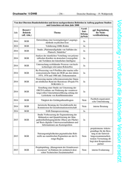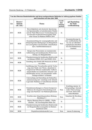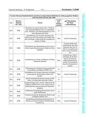 Deutscher Bundestag – 19. Wahlperiode – 251 – Drucksache 19/2448 Vorabfassung - wird durch die lektorierte Version ersetzt. Von den Obersten Bundesbehörden und deren nachgeordneten Behörden in Auftrag gegebene Studien und Gutachten seit dem Jahr 2000 Veröf- Ressort / ggf. Begründung fent- Jahr Behörde Thema für Nicht- lichung (off. Abk.) veröffentlichung Ja/Nein Recherche der gegenwärtigen Zinn-, Wolfram- und Antimonproduktion und von zukünftigen 2013 BGR Ja Zinn-, Wolfram- und Antimonprojekten in Viet- nam, Myanmar und China Durchführung einer Projektevaluierung und Prüfmission zur Vorbereitung eines Folgevorha- 2013 BGR Nein interne Evaluierung bens im Projekt Verbesserung des Grundwasser- schutzes Vietnam Gesamte Studie nicht veröffentlicht, aber Pub- Entwicklung eines Beurteilungssystems eine ef- likationen über den In- 2013 BGR fiziente Lagerstättennutzung im Sinne der Nach- Nein halt. Es ist geplant eine haltigkeit Kurzversion zu publizie- ren. projektinterne Arbeits- grundlage für die Bera- tung in der Entwick- Ausarbeitung von Terms of Reference für Berg- 2013 BGR Nein lungszusammenarbeit, baukataster Burundi weitere Verwertung ob- liegt dem Kooperations- partner Vulkanologische Charakterisierung potenzieller 2013 BGR Ja Lizenzflächen im Rahmen INDEX 2013 Durchführung der Projektevaluierung im Projekt 2013 BGR „Umsetzung der Seerechtskonvention (UN- Nein interne Evaluierung CLOS)“ InSAR-Studie/InSAR-Baseline Studie im Rift 2013 BGR Ja Valley von Kenia über dem Paka Vulkan Fluidprobenahme und –analytik während der Ex- peditionen INDEX 2013 sowie Analyse der Ex- 2013 BGR Ja peditionsproben und geochemische Dateninter- pretation Validierung Geomorphografische Karte und di- 2013 BGR Ja gitale Bodenkarten Charakterisierung der benthischen Biodiversität 2013 BGR Ja im Rahmen INDEX 2013 Durchführung Projektfortschrittskontrolle im 2013 BGR Rahmen des Sektorvorhabens Politikberatung Nein interne Evaluierung Grundwasser