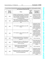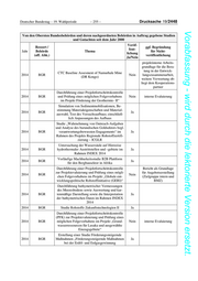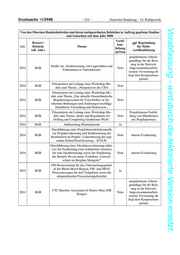 Drucksache 19/2448 – 254 – Deutscher Bundestag – 19. Wahlperiode Vorabfassung - wird durch die lektorierte Version ersetzt. Von den Obersten Bundesbehörden und deren nachgeordneten Behörden in Auftrag gegebene Studien und Gutachten seit dem Jahr 2000 Veröf- Ressort / ggf. Begründung fent- Jahr Behörde Thema für Nicht- lichung (off. Abk.) veröffentlichung Ja/Nein projektinterne Arbeits- grundlage für die Bera- tung in der Entwick- Studie zur „Neubewertung von Lagerstätten und 2014 BGR Nein lungszusammenarbeit, Vorkommen in Tadschikistan“ weitere Verwertung ob- liegt dem Kooperations- partner Präsentation mit Leitung eines Workshop-Mo- 2014 BGR Nein duls zum Thema „ Perspektiven des CEO Präsentation mit Leitung eines Workshop-Mo- duls zum Thema „Das aktuelle Neuseeländische 2014 BGR Regulierungssystem für Vorschriften zu Ge- Nein othermie-Bohrungen und Änderungsvorschläge. Detaillierte Vorstellung und Diskussion „ Präsentation mit Leitung eines Workshop-Mo- Projektinterne Fortbil- 2014 BGR duls zum Thema „Rules and Regulations for Nein dung von Mitarbeitern Drilling and Completing Geothermal Wells” des Projektpartners 2014 BGR Aufbereitung Platinminerale Ja Durchführung einer Projektfortschrittskontrolle zur Projektevaluierung und Strukturierung der 2014 BGR Nein interne Evaluierung Restlaufzeit im Projekt „Unterstützung der regi- onalen Rohstoffzertifizierung – ICGLR“ Durchführung einer Abschlussevaluierung inklu- sive der Erarbeitung eines kohärenten Ansatzes 2014 BGR für eine Nachbetreuung sowie der Sondierung Nein interne Evaluierung des Bedarfs für ein neues Vorhaben „Umwelt- schutz im Bergbau Mongolei“ PSI-Prozessierung für das Untersuchungsgebiet in der Rhein-Mosel-Region, PSI- und SBAS 2014 BGR Ja Prozessierungen für drei Teilgebiete sowie die entsprechenden Prozessierungsberichte projektinterne Arbeits- grundlage für die Bera- tung in der Entwick- CTC Baseline Assesment of Matete Mine (DR 2014 BGR Nein lungszusammenarbeit, Kongo) weitere Verwertung ob- liegt dem Kooperations- partner