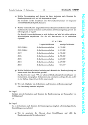 Deutscher Bundestag – 19. Wahlperiode – 103 – Drucksache 19/10481 Vorabfassung - wird durch die lektorierte Version ersetzt. e) Welche Personalzahlen und -kosten hat diese Institution nach Kenntnis der Bundesregierung jeweils pro Jahr insgesamt zu tragen? Die 31 Stellen werden im Rahmen eines Personalkostenansatzes von insgesamt 1.754.000 EURO (Soll 2019) finanziert. f) Welche weiteren Kosten aufgeschlüsselt nach Liegenschaftskosten und sonstigen Sachkosten hat diese Institution nach Kenntnis der Bundesregierung jeweils pro Jahr insgesamt zu tragen? Der Begriff Liegenschaftskosten ist nicht definiert und wird als solcher nicht im Wirtschaftsplan ausgewiesen. Der Sitz des Bach-Archivs ist in städtischem Eigentum. IST in EURO Liegenschaftskosten sonstige Sachkosten 2019 (SOLL): In Sachkosten enthalten 1.159.000 2018 (SOLL): In Sachkosten enthalten 1.167.000 2017: In Sachkosten enthalten 1.198.000 2016: In Sachkosten enthalten 2.498.000 2015: In Sachkosten enthalten 1.687.800 2014: In Sachkosten enthalten 1.129.900 2013: In Sachkosten enthalten 934.517 g) Welche Rechtsform hat diese Institution nach Kenntnis der Bundesregierung und warum wurde diese Rechtsform gewählt? Das Bach-Archiv wurde 1998, vor allem mit Blick auf mögliche Zustiftungen von bedeutendem Autographen, Dokumenten und sonstigem Archivgut für das Archiv in eine Stiftung bürgerlichen Rechts umgewandelt. h) Wie viele Mitglieder hat die Institution nach Kenntnis der Bundesregierung? Die Einrichtung hat keine Mitglieder. Zu Frage 2 Betätigt sich die Institution nach Kenntnis der Bundesregierung als Herausgeber von Publikationen? Ja. Zu Frage 3 Ist es der Institution nach Kenntnis der Bundesregierung möglich, selbstständig politische Empfehlungen zu erarbeiten? a) Wer ist gemeinhin der Adressat dieser Empfehlungen und zählt die Bundesregierung im Besonderen dazu?