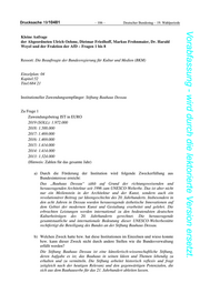 Drucksache 19/10481 – 106 – Deutscher Bundestag – 19. Wahlperiode Vorabfassung - wird durch die lektorierte Version ersetzt. Kleine Anfrage der Abgeordneten Ulrich Oehme, Dietmar Friedhoff, Markus Frohnmaier, Dr. Harald Weyel und der Fraktion der AfD – Fragen 1 bis 8 Ressort: Die Beauftragte der Bundesregierung für Kultur und Medien (BKM) Einzelplan: 04 Kapitel:52 Titel:684 21 Institutioneller Zuwendungsempfänger: Stiftung Bauhaus Dessau Zu Frage 1 Zuwendungsbetrag IST in EURO 2019 (SOLL): 1.972.000 2018: 1.588.000 2017: 1.469.000 2016: 1.469.000 2015: 1.414.000 2014: 1.414.000 2013: 1.324.000 (Hinweis: Zahlen für das gesamte Jahr) a) Durch die Förderung der Institution wird folgende Zweckerfüllung aus Bundesinteresse erreicht: Das „Bauhaus Dessau“ zählt auf Grund der richtungsweisenden und herausragenden Architektur seit 1996 zum UNESCO-Welterbe. Das ist aber nicht nur ein Meilenstein in der Architektur und der Kunst, sondern auch ein revolutionärer Beitrag zur Ideengeschichte des 20. Jahrhunderts. Insbesondere in den acht Jahren in Dessau wurden herausragende ästhetische Innovationen auf dem Gebiet der modernen Kunst und Gestaltung erarbeitet und gelehrt. Die erbrachten Leistungen werden international zu den bedeutendsten deutschen Kulturbeiträgen des 20. Jahrhunderts gerechnet. Die herausragende gesamtstaatliche und internationale Bedeutung dieser UNESCO-Welterbestätte rechtfertigt die Beteiligung des Bundes an der Stiftung Bauhaus Dessau. b) Welchen Zweck hatte bzw. hat diese Institutionen im Einzelnen und wieso konnte bzw. kann dieser Zweck nicht durch andere Stellen wie die Bundesverwaltung erfüllt werden? Die Stiftung Bauhaus Dessau ist eine künstlerisch-wissenschaftliche Stiftung, deren Aufgabe es ist, das Bauhaus in seinen Ideen und Themen lebendig zu erhalten und zu vermitteln. Die Stiftung arbeitet historisch reflexiv und fragt zeitgleich nach der heutigen Relevanz und den gegenwärtigen Potenzialen, die sich aus dem Bauhauserbe für das 21. Jahrhundert ableiten lassen.