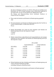 Drucksache 19/10481 – 102 – Deutscher Bundestag – 19. Wahlperiode Vorabfassung - wird durch die lektorierte Version ersetzt. Kleine Anfrage der Abgeordneten Ulrich Oehme, Dietmar Friedhoff, Markus Frohnmaier, Dr. Harald Weyel und der Fraktion der AfD – Fragen 1 bis 8 Ressort: Die Beauftragte der Bundesregierung für Kultur und Medien (BKM) Einzelplan: 04 Kapitel: 52 Titel: 684 21 Erl. Ziff. 1.1.4 Institutioneller Zuwendungsempfänger: Stiftung Bach-Archiv Leipzig Zu Frage 1 Zuwendungsbetrag IST in EURO 2019 (SOLL): 787.000 2018: 742.000 2017: 716.000 2016: 696.000 2015: 661.000 2014: 661.000 2013: 661.000 (Hinweis: Zahlen für das gesamte Jahr) a) Durch die Förderung der Institution wird folgende Zweckerfüllung aus Bundesinteresse erreicht: Bewahrung des kulturellen Erbes von nationalem und internationalem Rang, Förderung von Erforschung und Vermittlung von Leben, Wirken und Schaffen Johann Sebastian Bachs b) Welchen Zweck hatte bzw. hat diese Institutionen im Einzelnen und wieso konnte bzw. kann dieser Zweck nicht durch andere Stellen wie die Bundesverwaltung erfüllt werden? Wahrnehmung nationaler Verantwortung für die Bewahrung, Pflege und Vermittlung des kulturellen Erbes von nationalem und internationalem Rang; ohne die Beteiligung des Bundes ist die Finanzierung der Arbeit der Einrichtung durch Stadt Leipzig, Freistaat Sachsen sowie Spenden nicht zu leisten. c) Wann wurde die Institution nach Kenntnis der Bundesregierung gegründet? Gegründet 1950; Umwandlung in die Nationalen Forschungs- und Gedenkstätten Johann Sebastian Bach; 1991 Rückbenennung und Neuorganisation als Bach- Archiv Leipzig d) Wo hat die Institution nach Kenntnis der Bundesregierung ihren Sitz? Im Fall von weiteren Niederlassungen, wo haben diese ihren Sitz? Leipzig.