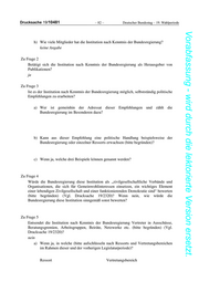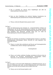Deutscher Bundestag – 19. Wahlperiode – 87 – Drucksache 19/10481 Vorabfassung - wird durch die lektorierte Version ersetzt. a) Wer ist gemeinhin der Adressat dieser Empfehlungen und zählt die Bundesregierung im Besonderen dazu? b) Kann aus dieser Empfehlung eine politische Handlung beispielsweise der Bundesregierung oder einzelner Ressorts erwachsen (bitte begründen)? c) Wenn ja, welche drei Beispiele können genannt werden? Zu Frage 4 Würde die Bundesregierung diese Institution als „zivilgesellschaftliche Verbände und Organisationen, die sich für Gemeinwohlinteressen einsetzen, ein wichtiges Element einer lebendigen Zivilgesellschaft und einer funktionierenden Demokratie sind“ bewerten (bitte begründen) (Vgl. Drucksache 19/2320)? Wenn nein, wie würde die Bundesregierung diese Institution sinngemäß sonst bewerten? Zu Frage 5 Entsendet die Institution nach Kenntnis der Bundesregierung Vertreter in Ausschüsse, Beratungsgremien, Arbeitsgruppen, Beiräte, Netzwerke etc. (bitte begründen) (Vgl. Drucksache 19/2320)? Nein a) Wenn ja, in welche (bitte aufschlüsseln nach Ressorts und Vertretungsbereichen im Rahmen dieser und der vorherigen Legislaturperiode)? Ressort Vertretungsbereich b) Wenn ja, auf welcher rechtlichen Grundlage entscheiden die Ressorts über die Besetzung der Ausschüsse, Beratungsgremien, Arbeitsgruppen, Beiräte, Netzwerke etc. (bitte aufschlüsseln nach jeweiliger Institution)? Zu Frage 6 Fand oder findet in den letzten beiden Wahlperioden ein Mitarbeiteraustausch, etwa in Form der Überlassung oder Leihe, zwischen Bundesministerien und nachgeordneten Behörden auf der einen und der Institution auf der anderen Seite statt? Nein a) Wenn ja, um wie viele Personen handelt es sich?