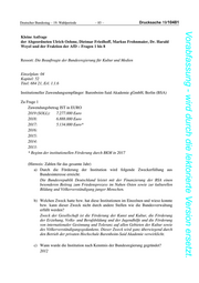 Deutscher Bundestag – 19. Wahlperiode – 85 – Drucksache 19/10481 Vorabfassung - wird durch die lektorierte Version ersetzt. Kleine Anfrage der Abgeordneten Ulrich Oehme, Dietmar Friedhoff, Markus Frohnmaier, Dr. Harald Weyel und der Fraktion der AfD – Fragen 1 bis 8 Ressort: Die Beauftragte der Bundesregierung für Kultur und Medien Einzelplan: 04 Kapitel: 52 Titel: 684 21, Erl. 1.1.6 Institutioneller Zuwendungsempfänger: Barenboim-Said Akademie gGmbH, Berlin (BSA) Zu Frage 1 Zuwendungsbetrag IST in EURO 2019 (SOLL): 7.277.000 Euro 2018: 6.888.000 Euro 2017: 5.134.000 Euro* 2016: 2015: 2014: 2013: * Beginn der institutionellen Förderung durch BKM in 2017 (Hinweis: Zahlen für das gesamte Jahr) a) Durch die Förderung der Institution wird folgende Zweckerfüllung aus Bundesinteresse erreicht: Die Bundesrepublik Deutschland leistet mit der Finanzierung der BSA einen besonderen Beitrag zum Friedensprozess im Nahen Osten sowie zur kulturellen Bildung und Völkerverständigung junger Menschen. b) Welchen Zweck hatte bzw. hat diese Institutionen im Einzelnen und wieso konnte bzw. kann dieser Zweck nicht durch andere Stellen wie die Bundesverwaltung erfüllt werden? Zweck der Gesellschaft ist die Förderung der Kunst und Kultur, die Förderung der Erziehung, Volks- und Berufsbildung und der Jugendhilfe und die Förderung von internationaler Gesinnung und Toleranz auf allen Gebieten der Kultur sowie des Völkerverständigungsgedankens. Dieser Zweck wird ganz überwiegend durch den Betrieb der privaten Hochschule Barenboim-Said Akademie verwirklicht. c) Wann wurde die Institution nach Kenntnis der Bundesregierung gegründet? 2012