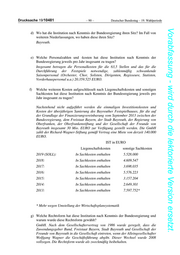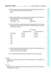 Drucksache 19/10481 – 86 – Deutscher Bundestag – 19. Wahlperiode Vorabfassung - wird durch die lektorierte Version ersetzt. d) Wo hat die Institution nach Kenntnis der Bundesregierung ihren Sitz? Im Fall von weiteren Niederlassungen, wo haben diese ihren Sitz? Berlin e) Welche Personalzahlen und -kosten hat diese Institution nach Kenntnis der Bundesregierung jeweils pro Jahr insgesamt zu tragen? Planstellen/Stellen: Kosten: 2019 (SOLL): 42,0 3.000.000 Euro f) Welche weiteren Kosten aufgeschlüsselt nach Liegenschaftskosten und sonstigen Sachkosten hat diese Institution nach Kenntnis der Bundesregierung jeweils pro Jahr insgesamt zu tragen? IST in EURO Liegenschaftskosten sonstige Sachkosten 2019 (SOLL): 691.000 4.504.000 2018: 590.000 3.562.000 2017: 327.000 4.274.000 2016: 2015: 2014: 2013: g) Welche Rechtsform hat diese Institution nach Kenntnis der Bundesregierung und warum wurde diese Rechtsform gewählt? Die BSA ist eine gemeinnützige GmbH. h) Wie viele Mitglieder hat die Institution nach Kenntnis der Bundesregierung? - Zu Frage 2 Betätigt sich die Institution nach Kenntnis der Bundesregierung als Herausgeber von Publikationen? Ja Zu Frage 3 Ist es der Institution nach Kenntnis der Bundesregierung möglich, selbstständig politische Empfehlungen zu erarbeiten?