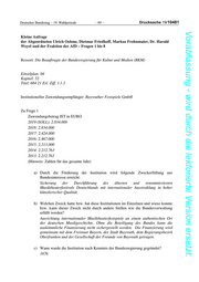 Deutscher Bundestag – 19. Wahlperiode – 89 – Drucksache 19/10481 Vorabfassung - wird durch die lektorierte Version ersetzt. Kleine Anfrage der Abgeordneten Ulrich Oehme, Dietmar Friedhoff, Markus Frohnmaier, Dr. Harald Weyel und der Fraktion der AfD – Fragen 1 bis 8 Ressort: Die Beauftragte der Bundesregierung für Kultur und Medien (BKM) Einzelplan: 04 Kapitel: 52 Titel: 684 21 Erl. Ziff. 1.1.3 Institutioneller Zuwendungsempfänger: Bayreuther Festspiele GmbH Zu Frage 1 Zuwendungsbetrag IST in EURO 2019 (SOLL): 2.834.000 2018: 2.834.000 2017: 2.424.000 2016: 2.467.000 2015: 2.213.000 2014: 2.212.763 2013: 2.212.763 (Hinweis: Zahlen für das gesamte Jahr) a) Durch die Förderung der Institution wird folgende Zweckerfüllung aus Bundesinteresse erreicht: Sicherung der Durchführung des ältesten und renommiertesten Musiktheaterfestivals Deutschlands mit internationaler Ausstrahlung in hoher künstlerischer Qualität. b) Welchen Zweck hatte bzw. hat diese Institutionen im Einzelnen und wieso konnte bzw. kann dieser Zweck nicht durch andere Stellen wie die Bundesverwaltung erfüllt werden? Ausrichtung internationaler Musiktheaterfestspiele an einem authentischen Ort der deutschen Musikgeschichte. Ohne die Beteiligung des Bundes kann die auskömmliche Finanzierung nicht sichergestellt werden. Die Finanzierung wird gemeinsam mit dem Freistaat Bayern, der Stadt Bayreuth, dem Regierungsbezirk Oberfranken und der Gesellschaft der Freunde von Bayreuth getragen. c) Wann wurde die Institution nach Kenntnis der Bundesregierung gegründet? 1876