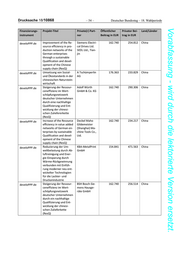 Drucksache 18/10868 – 52 – Deutscher Bundestag – 18. Wahlperiode Vorabfassung - wird durch die lektorierte Version ersetzt. Finanzierungs‐ Projekt‐Titel Private(r) Part‐ Öffentlicher Privater Bei‐ Land/Länder instrument ner Beitrag in EUR trag in EUR develoPPP.de Qualitfication of six sup‐ WOLF Lingerie 196.088 319.932 China pliers with targeted Ltd. measures and creation of vocational education structures in Chinas lin‐ gerie industry develoPPP.de Increase of Heat Supply Diehl Metering 1.061.000 1.115.000 China Energy Efficiency GmbH, Hefei Thermoelectric Group Co. Ltd., SIV Service für Informations‐ verarbeitung AG develoPPP.de Einführung eines paten‐ Ticket to 189.500 240.690 China tierten, atmungsaktiven Heaven A/S Stoffes (der bisher nicht in China produziert wurde) und deshalb Neustrukturierung der Stoffproduktion und Ein‐ führung international an‐ erkannter Produktions‐ und Sozialstandards develoPPP.de Improvement of Corpo‐ Würth Elektro‐ 171.390 238.560 China rate Social Responsibility nik GmbH & Co. & Technikcal Compliance KG within global supply net‐ works of German com‐ panies develoPPP.de Effizientes Leistungsma‐ tubus GmbH 181.341 223.303 China nagement und umwelt‐ gerechte Siedlungsent‐ wässerung ‐ Einführung von Planungsmethoden und Instandhaltungs‐ techniken inkl. Ausbil‐ dungs‐ & Fördermaßnah‐ men develoPPP.de Innovativer Technologie‐ Union GmbH 175.000 495.432 China transfer im Rahmen ei‐ Qualitätsketten nes neuen Joint Ven‐ tures mit einem lokalen Hersteller und Lieferan‐ ten, verbunden mit dem Aufbau einer eigenstän‐ digen modernen Monta‐ gefertigung. Verbesse‐ rung von Qualität, Um‐ weltschutz und Arbeitssi‐ cherheit.