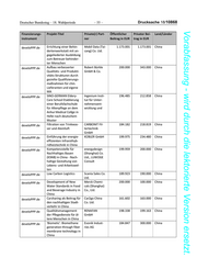 Deutscher Bundestag – 18. Wahlperiode – 55 – Drucksache 18/10868 Vorabfassung - wird durch die lektorierte Version ersetzt. Finanzierungs‐ Projekt‐Titel Private(r) Part‐ Öffentlicher Privater Bei‐ Land/Länder instrument ner Beitrag in EUR trag in EUR develoPPP.de Errichtung einer Behin‐ Mobil Data (Tai‐ 1.173.001 1.173.001 China dertenwerkstatt mit an‐ cang) Co. Ltd. gegeliederter Ausbildung zum Betreuer behinder‐ ter Menschen develoPPP.de Aufbau verbesserter Robert Bürkle 200.000 343.000 China Qualitäts‐ und Produkti‐ GmbH & Co. vitäts‐Strukturen durch gezielte Qualifizierungs‐ maßnahmen für chin. Lieferanten und eigene MA develoPPP.de SINO‐GERMAN Eldery‐ Ingenium Insti‐ 196.485 212.858 China Care School Etablierung tut für Unter‐ einer Berufsfachschule nehmensent‐ für Altenpflege an dem wicklung und Anhui Medical Collge in Hefei nach deutschem Muster develoPPP.de Filtration von Trinkwas‐ CARBONIT Fil‐ 184.182 218.819 China ser und Atemluft tertechnik GmbH develoPPP.de Einführung der energie‐ KÜBLER GmbH 199.975 234.480 China effizienten Infrarothyb‐ ridheiztechnik in China develoPPP.de Kompetenzstelle für energydesign 199.959 200.000 China Nachhaltiges Bauen (Shanghai) Co. (KSNB) in China ‐ Nach‐ Ltd., LUWOGE haltige Gestaltung von Consult Lebens‐ und Arbeitswel‐ ten develoPPP.de Low Carbon Logistics Scania Sales Co. 189.923 190.000 China Ltd. develoPPP.de Development of New Merck Chemi‐ 200.000 100.000 China Water Standards in Food cals (Shanghai) and Beverage Industry in Co., Ltd. China develoPPP.de Carsharing als Beitrag für Car2go China 161.602 163.000 China den nachhaltigen Stadt‐ Co. Ltd. verkehr in China develoPPP.de Qualitätsmanagement RENAFAN 198.338 199.163 China der Pflegedienste für äl‐ GmbH tere Menschen in China develoPPP.de 'Biometic': Biomethane Evonik Indust‐ 184.847 300.000 China generation through fiber ries AG membrane technology in China