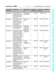 Drucksache 18/10868 – 56 – Deutscher Bundestag – 18. Wahlperiode Vorabfassung - wird durch die lektorierte Version ersetzt. Finanzierungs‐ Projekt‐Titel Private(r) Part‐ Öffentlicher Privater Bei‐ Land/Länder instrument ner Beitrag in EUR trag in EUR develoPPP.de Arbeitssicherheit, Ge‐ RAG Mining So‐ 144.501 147.044 China sundheitsschutz und Un‐ lutions GmbH fallverhütung (AGU) im chinesischen Bergbau unter Tage develoPPP.de The Green Star Initiative: Dole Europe 200.000 207.000 Costa Rica An innovative, inte‐ GmbH grated landscape man‐ agement model to ad‐ dress European con‐ sumer demand develoPPP.de Nachhaltige Wald‐Auf‐ Querdenker 197.000 253.770 Costa Rica forstung und integrier‐ GmbH & Puro tem Waldfeldbau Verde Paraiso Forestal S.A. develoPPP.de Förderung Erneuerbarer Renewables 171.532 218.570 Costa Rica Energien durch Einrich‐ Academy AG tung eines berufsbeglei‐ tenden Aufbaustudien‐ gangs zur Aus‐ und Wei‐ terbildung von Fachkräf‐ ten entlang der gesam‐ ten Wertschöpfungs‐ kette in Zentralamerika develoPPP.de Stärkung umweltfreund‐ Cobana 195.250 199.900 Costa Rica, licher u. innovativer An‐ Fruchtring Ecuador baupraktiken u. Schaf‐ GmbH & Co. KG fung ökonomischer Nachhaltigkeit v. Bana‐ nenproduzenten develoPPP.de Capacity Building für Blütenpracht 195.000 206.720 Costa Rica, Qualitätssicherung und GmbH Ecuador die internationale Ver‐ marktung von Schnitt‐ blumen durch kleine und mittelgroße Produzenten in Ecuador develoPPP.de Digital Manufacturing für SITEC Industrie‐ 198.526 290.288 Costa Rica, El Rapid‐Prototyping‐ und technologie Salvador Produktentwicklung in El GmbH Chemnitz Salvador und Costa Rica (DMRaPP) develoPPP.de Förderung des Mais‐ und Ivoire Coton 407.426 1.223.722 Côte d'Ivoire Sojaanbaus durch Klein‐ S.A. bauern im Norden der Elfenbeinküste. develoPPP.de Konsolidierung & Erwei‐ Bio Tropic 199.500 385.900 Côte d'Ivoire terung der Bio‐Agrarpro‐ GmbH duktion & Verarbeitung