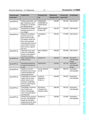 Drucksache 18/10868 – 58 – Deutscher Bundestag – 18. Wahlperiode Vorabfassung - wird durch die lektorierte Version ersetzt. Finanzierungs‐ Projekt‐Titel Private(r) Part‐ Öffentlicher Privater Bei‐ Land/Länder instrument ner Beitrag in EUR trag in EUR develoPPP.de Verbesserung der Quali‐ Eurostil S.R.L. 195.500 203.676 Dominikani‐ fikation von Näherinnen sche Republik und Führungskräften und Einführung neuer Produktionsmethodolo‐ gien in der Bekleidungs‐ industrie develoPPP.de Aufbau eines ökologi‐ Bio Tropic 181.460 238.700 Dominikani‐ schen Qualifikations‐ GmbH sche Republik und Informationszent‐ rum für die Implemen‐ tierung Grüner Techno‐ logien develoPPP.de Kleinbauernförderung im Cafédirect plc 161.000 206.158 Dominikani‐ Kaffeeanbau Unit F, Zetland sche Republik House develoPPP.de Verwertung organischer Fickert & Win‐ 192.000 253.223 Ecuador Abfälle durch Biogas‐ terling Maschi‐ technologie ‐ Kompeten‐ nenbau GmbH zentwicklung in Ecuador develoPPP.de Program to maintain and KAOKA SAS 190.000 210.077 Ecuador develop plantations of cacao of the variety "Nacional" and to im‐ prove cacao quality man‐ agement in Ecuador develoPPP.de Einführung von drei dua‐ Haver und 170.000 213.117 Ecuador len Ausbildungsgängen Boecker OHG für Mechaniker, Elektro‐ niker und Medientech‐ nologen in Ecuador develoPPP.de Dezentralisierung der ATB Umwelt‐ 197.648 202.298 Ecuador Abwasserreinigung auf technologien den Galapagos Inseln GmbH develoPPP.de Innovating Ecuadorian Internationale 168.000 257.700 Ecuador banana production Fruchtimport though organic and so‐ Gesellschaft cially responsible cultiva‐ Weichert GmbH tion of a new variety & Co.KG develoPPP.de Introduction of photo‐ IBC Solar AG 78.359 149.977 Ecuador voltaic energy in Ecuado‐ rian shrimp farming sec‐ tor develoPPP.de Achieving Sustainable Ecom Agroin‐ 194.001 198.694 Ecuador Production for Small Co‐ dustrial Corpo‐ coa Producers in Rural ration Ltd. Ecuador