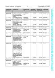 Deutscher Bundestag – 18. Wahlperiode – 53 – Drucksache 18/10868 Vorabfassung - wird durch die lektorierte Version ersetzt. Finanzierungs‐ Projekt‐Titel Private(r) Part‐ Öffentlicher Privater Bei‐ Land/Länder instrument ner Beitrag in EUR trag in EUR develoPPP.de Trinkwassererwär‐ DRECHSLER‐ 193.500 228.859 China mungs‐Anlagentechnik technik GmbH mit thermischer Desin‐ fektion zur Legionellen‐ vermeidung develoPPP.de Bambusforschungszent‐ Ningbo Happy 224.060 3.050.842 China rum mit Naturkindergar‐ Arts & Crafts ten Co. Ltd develoPPP.de Herstellung von Trans‐ Brugger GmbH 179.000 255.715 China parenz in den Lieferket‐ ten für Rohmagnete (Lie‐ ferantenqualifizierung). develoPPP.de Entwicklung, Einführung Dieffenbacher 194.000 476.543 China und Aufbau umwelt‐ GmbH Maschi‐ freundlicher Fertigungs‐ nen‐ und Anla‐ techniken gebau develoPPP.de Einrichtung eines Inno‐ PROGENIUM 164.694 247.041 China vations‐ und Technolo‐ GmbH & Co. KG gie‐Zentrum für alterna‐ Strategy & tive Mobilitätskonzepte Manangement in Qingdao Consulting develoPPP.de Verbesserung der Hygi‐ S+S Separation 161.500 383.778 China ene,‐ Umwelt‐ und Qua‐ and Sorting litätsstandards in der Le‐ Technology bensmittel‐und Phar‐ GmbH mabranche develoPPP.de Aufbau eines Trainings‐ Frerichs Glas 135.000 250.876 China zentrums innerhalb des GmbH Technologieparks in Weifang develoPPP.de Bau eines Ausbildungs‐ Schaeffler Tech‐ 900.000 1.658.000 China werks in Yinchuan nologies AG & Co.KG develoPPP.de Pilotanlage Akupress zur Bellmer Kuf‐ 140.723 328.215 China Behandlung von Gärres‐ ferath Machi‐ ten nery GmbH develoPPP.de Capacity Building für GLOBALG.A.P. 164.092 172.853 China chinesische Farmer c/o FoodPLUS GmbH develoPPP.de Einrichtung eines Ausbil‐ Volkswagen 111.395 111.395 China dungsgangs für Mechat‐ (China) Invest‐ roniker ment CO. Ltd develoPPP.de Demonstrationsprojekt DB Schenker 159.429 248.729 China zur Umrüstung bzw. Auf‐ China Ltd bau von ökologisch nachhaltigen Waren‐ und Lagerhäusern