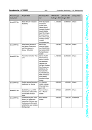 Drucksache 18/10868 – 60 – Deutscher Bundestag – 18. Wahlperiode Vorabfassung - wird durch die lektorierte Version ersetzt. Finanzierungs‐ Projekt‐Titel Private(r) Part‐ Öffentlicher Privater Bei‐ Land/Länder instrument ner Beitrag in EUR trag in EUR develoPPP.de West‐African Transport ETTP (European 1.215.000 1.499.450 Ghana Academy Truck and Trailer Parts (West Africa) Limited), Robert Bosch Middle East FZE, Ghana Branch, Scania West Africa Ltd., WABCO GmbH, ZF Frie‐ drichshafen AG develoPPP.de Solar‐based decentral‐ BAUER Re‐ 199.981 369.144 Ghana ized Water Treatment sources GmbH and Distribution in Ltd., BAUER Wa‐ Ghana ‐ SOLAWA ter GmbH, GWE Pumpenboese GmbH develoPPP.de Prevention is better than Claron Health 1.246.900 2.390.630 Ghana cure International, Ghana Commu‐ nity Network Services Ltd. (GCNet), Golden Star Resources (GSR) Ltd, Na‐ tionwide Mu‐ tual Healthcare, NMS Infrastruc‐ ture (NMSI), Sysmex Europe GmbH develoPPP.de Quality assured essential 1 A Pharma 200.000 450.000 Ghana medicines for Ghana GmbH, LaGray Chemical Com‐ pany Ltd. develoPPP.de GLASS Ghana Land Ad‐ Assmann Bera‐ 197.925 209.979 Ghana ministration Solution for ten + Planen Sustainable Develop‐ GmbH ment develoPPP.de Qualifizierung von Klein‐ Klaus Böcker 200.000 209.136 Guatemala bauern im Anbau von GmbH tropischen Früchten und Verbesserung ihrer wirt‐ schaftlichen und sozialen Bedingungen