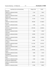Deutscher Bundestag – 18. Wahlperiode – 43 – Drucksache 18/1422 Land/Jahr/ALPos mit Beschreibung Menge in Stk. WERT BELGIEN A0003A 01, militärische Kaliber 2 320 1 486 € FRANKREICH A0003A 01, militärische Kaliber 32 000 201 241 € GRÖNLAND A0003A 01, militärische Kaliber 59 180 14 150 € IRAK A0003A 01, militärische Kaliber 598 000 272 000 € ISLAND A0003A 01, militärische Kaliber 2 800 1 159 € KANADA A0003A 01, militärische Kaliber 1 999 200 160 000 € KASACHSTAN A0003A 01, militärische Kaliber 8 000 3 200 € LIBANON A0003A 01, militärische Kaliber 80 000 31 530 € LITAUEN A0003A 01, militärische Kaliber 240 000 134 400 € LUXEMBURG A0003A 01, militärische Kaliber 50 000 30 750 € NAMIBIA A0003A 01, militärische Kaliber 1 114 700 128 703 € NIEDERLANDE A0003A 01, militärische Kaliber 250 000 86 250 € NORWEGEN A0003A 01, militärische Kaliber 330 000 108 979 € OMAN A0003A 01, militärische Kaliber 5 000 1 330 € ÖSTERREICH A0003A 01, militärische Kaliber 9 460 32 491 € PERU A0003A 01, militärische Kaliber 2 000 2 600 € RUSSISCHE FÖDERATION A0003A 01, militärische Kaliber 420 010 291 068 € SAMBIA A0003A 01, militärische Kaliber 15 000 9 000 €