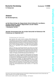 Deutscher Bundestag Drucksache 19/4496 19. Wahlperiode 25.09.2018 Vorabfassung - wird durch die lektorierte Version ersetzt. Antwort der Bundesregierung auf die Kleine Anfrage der Abgeordneten Sylvia Kotting-Uhl, Lisa Badum, Annalena Baerbock, weiterer Abgeordneter und der Fraktion BÜNDNIS 90/DIE GRÜNEN – Drucksache 19/4159 – Aktueller Kenntnisstand über den ernsten Atomunfall mit Ruthenium-106- Freisetzung vom September 2017 Vorbemerkung der Fragesteller Ende September 2017 wurden vielerorts in Europa erhöhte Ruthenium-106- Werte gemessen. Die Freisetzung war so erheblich, dass es sich nach Einschät- zung der Bundesregierung um einen Atomunfall der dritthöchsten Kategorie auf der Internationalen Bewertungsskala für nukleare und radiologische Ereignisse (INES) gehandelt haben muss, Kategorie 5, das heißt um einen ernsten Atomun- fall, vgl. Antwort der Bundesregierung vom 14. März 2018 auf die Schriftliche Frage 117 der Abgeordneten Sylvia Kotting-Uhl auf Bundestagsdrucksa- che 19/1241. Infolge der Messungen angestellte Berechnungen und Analysen des hiesigen Bundesamtes für Strahlenschutz (BfS) und des staatlichen französischen Insti- tuts für Strahlenschutz und Nuklearsicherheit IRSN deuteten relativ zeitnah auf die Region Süd-Ural als wahrscheinlichsten Ursprung der Freisetzung hin. Ge- wissheit konnten diese Berechnungen und Analysen aufgrund der nur einge- schränkt zur Verfügung stehenden Informationen jedoch nicht liefern. Im Dezember 2017 wurde vom Institut für Nuklearsicherheit der Russischen Akademie der Wissenschaften (IBRAE) für diesen Ruthenium-106-Atomunfall eine Internationale Unabhängige Wissenschaftliche Untersuchungskommission (im Weiteren kurz Untersuchungskommission) ins Leben gerufen, an der sich zwei BfS-Mitarbeiter beteiligten, vgl. BfS-Pressemitteilung vom 22. Januar 2018. Während die Fragestellenden die IBRAE-Initiative zwar durchaus begrü- ßen, verweisen sie darauf, dass es sich beim IBRAE nicht um eine Atomaufsicht handelt. Es bleibt also festzustellen, dass diese Initiative nicht von den für die Atomaufsicht und den Strahlenschutz zuständigen dortigen staatlichen Stellen ausgeht. Die Untersuchungskommission tagte zweimal, am 31. Januar und 11. April 2018. Die Antwort wurde namens der Bundesregierung mit Schreiben des Bundesministeriums für Umwelt, Naturschutz und nukleare Sicherheit vom 20. September 2018 übermittelt. Die Drucksache enthält zusätzlich – in kleinerer Schrifttype – den Fragetext.