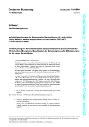 Deutscher Bundestag Drucksache 19/4440 19. Wahlperiode 20.09.2018 Vorabfassung - wird durch die lektorierte Version ersetzt. Antwort der Bundesregierung auf die Kleine Anfrage der Abgeordneten Martina Renner, Dr. André Hahn, Gökay Akbulut, weiterer Abgeordneter und der Fraktion DIE LINKE. – Drucksache 19/3998 – Twitternutzung des Parlamentarischen Staatssekretärs beim Bundesminister für Wirtschaft und Energie und Beauftragten der Bundesregierung für Mittelstand und für die neuen Bundesländer Vorbemerkung der Fragesteller Der Parlamentarische Staatssekretär beim Bundesminister für Wirtschaft und Energie (BMWi) und Beauftragte der Bundesregierung für Mittelstand und für die neuen Bundesländer, Christian Hirte, nutzt zur Darstellung seiner Arbeit u. a. den Twitter-Account @ChristianHirte. In seiner Twitter-Biographie wird neben seiner Tätigkeit für die Bundesregie- rung darauf hingewiesen, dass er stellvertretender Landesvorsitzender der CDU Thüringen ist. In seinen Tweets teilt er Vorgänge und Themen seiner dienstlichen Tätigkeit, z. B. aus dem Bundeskabinett, aus seiner Wahlkreisarbeit als Bundestagsabge- ordneter und eindeutig parteipolitische Vorgänge, z. B. teilt er Beiträge seiner Landespartei CDU Thüringen, des CDU-Landesvorsitzenden Mike Mohring, der Bundes-CDU oder der CDU-Jugendorganisation Junge Union. Das BMWi hat in der Vergangenheit wiederholt Tweets vom Account @ChristianHirte über den offiziellen Twitter-Account des Bundesministeriums geteilt. 1. Ist der Twitter-Account von Christian Hirte (@christianhirte) privat oder amtlich? Der Twitter-Account von Christian Hirte (@christianhirte) ist privat. 2. Verfassen Bedienstete der Bundesregierung Beiträge für den Twitter-Ac- count @christianhirte? Wenn ja, wie viele Mitarbeiter sind daran beteiligt, in welchem zeitlichen Umfang geschieht das, und welche Kosten entstehen der Bundesregierung dadurch? Die Antwort wurde namens der Bundesregierung mit Schreiben des Bundesministeriums für Wirtschaft und Energie vom 17. September 2018 übermittelt. Die Drucksache enthält zusätzlich – in kleinerer Schrifttype – den Fragetext.