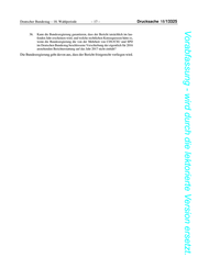 Deutscher Bundestag – 18. Wahlperiode – 17 – Drucksache 18/13325 Vorabfassung - wird durch die lektorierte Version ersetzt. 36. Kann die Bundesregierung garantieren, dass der Bericht tatsächlich im lau- fenden Jahr erscheinen wird, und welche rechtlichen Konsequenzen hätte es, wenn die Bundesregierung die von der Mehrheit von CDU/CSU und SPD im Deutschen Bundestag beschlossene Verschiebung der eigentlich für 2016 anstehenden Berichterstattung auf das Jahr 2017 nicht einhält? Die Bundesregierung geht davon aus, dass der Bericht fristgerecht vorliegen wird.