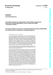 Deutscher Bundestag Drucksache 19/7484 19. Wahlperiode 01.02.2019 Vorabfassung - wird durch die lektorierte Version ersetzt. Antwort der Bundesregierung auf die Kleine Anfrage der Abgeordneten Fabio De Masi, Jörg Cezanne, Klaus Ernst, weiterer Abgeordneter und der Fraktion DIE LINKE. – Drucksache 19/6767 – Cum-Fake: Die Rolle von American und Global Depository Receipts (ADRs/GDRs) bei missbräuchlicher Erstattung von Kapitalertragsteuern Vorbemerkung der Fragesteller Ein American Depository Receipts (ADR) ist ein auf US-Dollar lautendes Zer- tifikat (Hinterlegungsschein). ADRs werden in den USA von Depotbanken aus- gegeben und verkörpern eine bestimmte Anzahl von Aktien eines ausländischen Unternehmens, die anstelle der Aktien am US-Kapitalmarkt gehandelt werden. Dabei können auch sogenannte vorläufige ADRs (pre-released ADRs) vor Hin- terlegung der Aktien ausgegeben werden, um Liquidität zu gewährleisten. Durch die Ausgabe vorläufiger ADRs kurz vor dem Dividendenstichtag sowie deren Rücknahme kurz nach dem Dividendenstichtag wurden laut Medienbe- richten unter anderem in Deutschland unrechtmäßig Kapitalertragsteuererstat- tungen erwirkt (www.tagesschau.de/wirtschaft/steuerraub-101.html). Laut der US-Börsenaufsicht wurden dabei vorläufige ADRs ausgegeben, die je- doch nicht im selben Umfang durch ausländische Aktien gedeckt waren (www. sec.gov/news/press-release/2018-138). Vertreter des Bundesministeriums der Finanzen (BMF) führten in der Sitzung des Finanzausschusses am 28. November 2018 aus, dass ein wesentliches Motiv für die Ausstellung von vorläufigen ADRs Steuergestaltung sei. In der Schrift- lichen Antwort der Bundesregierung auf die Mündliche Frage 76 des Abgeord- neten Fabio De Masi vom 28. November 2018 (Plenarprotokoll 19/67, S. 7685 (B)) heißt es entgegen der in der Berichterstattung geäußerten Verdachtsmo- mente: „[D]er Bundesregierung und den Bundesbehörden [liegen] keine An- haltspunkte vor“, dass „es im Zusammenhang mit ADR-Papieren möglich ist, entsprechend den Sachverhalten bei den Cum/Ex-Geschäften Kapitalertragsteu- ern erstattet zu bekommen, die nicht einbehalten wurden“. Trotzdem hat die Bundesregierung vorsorglich das Datenträgerverfahren im Zusammenhang mit ADRs ausgesetzt „[n]achdem im Zuge der Feststellungen der US-amerikani- schen Börsenaufsichtsbehörde bekannt wurde, dass mehrere Banken planmäßig auch nach 2012 ADRs mit dem Ziel ausgegeben haben, in Staaten außerhalb der USA unberechtigte Steuererstattungen zu ermöglichen und deshalb nicht aus- geschlossen werden kann, dass solche Papiere auch im Zusammenhang mit deutschen Aktien genutzt wurden […]“. Die Antwort wurde namens der Bundesregierung mit Schreiben des Bundesministeriums der Finanzen vom 30. Januar 2019 übermittelt. Die Drucksache enthält zusätzlich – in kleinerer Schrifttype – den Fragetext.