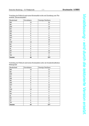 Deutscher Bundestag – 18. Wahlperiode –3– Drucksache 18/9991 Vorabfassung - wird durch die lektorierte Version ersetzt. Verteilung der Politisch motivierten Kriminalität-rechts mit Zuordnung zum The- menfeld „Hasskriminalität“: Bundesland Gewalttaten Sonstige Straftaten BB 10 26 BE 2 17 BW 1 18 BY 4 37 HB 0 1 HE 0 2 HH 0 0 MV 4 15 NI 3 38 NW 10 37 RP 3 12 SH 0 2 SL 0 1 SN 1 24 ST 8 19 TH 0 4 Summe 46 253 Verteilung der Politisch motivierten Kriminalität-rechts mit fremdenfeindlichem Hintergrund: Bundesland Gewalttaten Sonstige Straftaten BB 10 23 BE 2 13 BW 1 17 BY 4 31 HB 0 1 HE 0 2 HH 0 0 MV 4 14 NI 2 35 NW 10 31 RP 3 11 SH 0 1 SL 0 0 SN 1 21 ST 6 15 TH 0 2 Summe 43 217