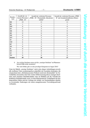 Deutscher Bundestag – 18. Wahlperiode –7– Drucksache 18/9991 Vorabfassung - wird durch die lektorierte Version ersetzt. Anzahl der ver- Anzahl der verletzten Personen Anzahl der verletzten Personen „PMK - Bundes- letzten Personen „PMK - R“; Themenfeld „Hasskrimi- R“ mit fremdenfeindlichem Hinter- land „PMK - R“ nalität“ grund BB 15 11 11 BE 1 1 1 BW 0 0 0 BY 5 5 5 HB 0 0 0 HE 0 0 0 HH 0 0 0 MV 9 5 5 NI 4 3 2 NW 6 6 6 RP 2 2 2 SH 0 0 0 SL 0 0 0 SN 2 0 0 ST 5 5 5 TH 0 0 0 Summe 49 38 37 8. Aus welchen Straftaten setzen sich die „sonstigen Straftaten“ im Phänomen- bereich PMK-rechts zusammen? Wie viele Delikte gab es in den jeweiligen Kategorien im August 2016? Unter der Rubrik „sonstige Straftaten“ sind in den obigen Aufstellungen jeweils alle strafbaren Taten zusammengefasst aufgeführt mit Ausnahme derjenigen, die entsprechend dem „Definitionssystem Politisch motivierte Kriminalität“ als Ge- waltdelikte einzustufen sind. Eine weitere Differenzierung dieser sonstigen Straf- taten nach einzelnen Straftatbeständen wäre im Hinblick auf die Vielzahl der denkbaren Straftatbestände sowie vor dem Hintergrund der Vorläufigkeit der hier dargestellten Zahlen und des Umfangs der infolge von Nachmeldungen ohnehin zu erwartenden Änderungen mit einem unangemessenen Verwaltungsaufwand verbunden.