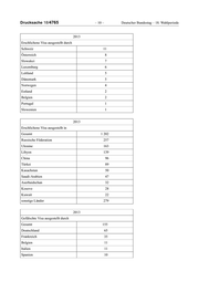 Drucksache 18/4765 – 10 – Deutscher Bundestag – 18. Wahlperiode 2013 Erschlichene Visa ausgestellt durch Schweiz 11 Österreich 8 Slowakei 7 Luxemburg 6 Lettland 5 Dänemark 5 Norwegen 4 Estland 2 Belgien 2 Portugal 1 Slowenien 1 2013 Erschlichene Visa ausgestellt in Gesamt 1 202 Russische Föderation 257 Ukraine 163 Libyen 139 China 96 Türkei 89 Kasachstan 50 Saudi-Arabien 47 Aserbaidschan 32 Kosovo 28 Kuwait 22 sonstige Länder 279 2013 Gefälschte Visa ausgestellt durch Gesamt 155 Deutschland 65 Frankreich 35 Belgien 11 Italien 11 Spanien 10