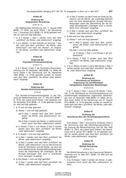 Bundesgesetzblatt Jahrgang 2017 Teil I Nr. 16, ausgegeben zu Bonn am 4. April 2017 Artikel 24 Änderung der Verordnung über die Ausbildung und Prüfung für den höheren technischen Dienst in der Bundeswehrverwaltung – Fachrichtung Wehrtechnik – (2030-7-17-5) Die Verordnung über die Ausbildung und Prüfung für den höheren technischen Dienst in der Bundeswehrver- waltung – Fachrichtung Wehrtechnik – vom 31. März 2010 (BGBl. I S. 366), die durch Artikel 7 des Gesetzes vom 20. November 2015 (BGBl. I S. 2010) geändert worden ist, wird wie folgt geändert: 1. In § 24 Absatz 3 Satz 2 werden nach dem Wort „schriftlichen“ die Wörter „oder elektronischen“ ein- gefügt. 2. In § 18 Absatz 3 Satz 5, § 23 Absatz 5 Satz 3, § 26 Absatz 7 und § 30 Absatz 4 werden jeweils nach dem Wort „schriftlich“ die Wörter „oder elektronisch“ eingefügt. 633 Artikel 26 Änderung der Verordnung über den Vorbereitungsdienst für den gehobenen technischen Verwaltungsdienst in der Wasser- straßen- und Schifffahrtsverwaltung des Bundes (2030-8-5-1) Die Verordnung über den Vorbereitungsdienst für den gehobenen technischen Verwaltungsdienst in der Was- serstraßen- und Schifffahrtsverwaltung des Bundes vom 14. Dezember 2012 (BGBl. I S. 2974), die durch Artikel 3 der Verordnung vom 2. Juni 2016 (BGBl. I S. 1257) geändert worden ist, wird wie folgt geändert: 1. In § 21 Absatz 8 Satz 2 wird das Wort „schriftlichen“ gestrichen. 2. In § 22 Absatz 4 Satz 3 wird das Wort „unterschrei- ben“ durch das Wort „bestätigen“ ersetzt. Artikel 27 Änderung der Verordnung über den Vorbereitungsdienst für den gehobenen Verwaltungsinformatikdienst des Bundes Artikel 25 (2030-8-5-2) Änderung der Verordnung über die Laufbahn, Ausbildung und Prüfung für den höheren technischen Verwaltungsdienst des Bundes Die Verordnung über den Vorbereitungsdienst für den gehobenen Verwaltungsinformatikdienst des Bundes vom 8. Dezember 2012 (BGBl. I S. 2622) wird wie folgt geändert: (2030-7-25-2) Die Verordnung über die Laufbahn, Ausbildung und Prüfung für den höheren technischen Verwaltungs- dienst des Bundes vom 20. August 2004 (BGBl. I S. 2230), die zuletzt durch Artikel 2 der Verordnung vom 2. Juni 2016 (BGBl. I S. 1257) geändert worden ist, wird wie folgt geändert: 1. Dem § 17 Absatz 4 wird folgender Satz angefügt: „Sofern die schriftliche Ausarbeitung elektronisch übermittelt werden kann, kann die Versicherung auch elektronisch abgegeben werden.“ 2. In § 18 Absatz 5 Satz 2 wird das Wort „unterschrei- ben“ durch das Wort „bestätigen“ ersetzt. Artikel 28 1. § 17 wird wie folgt geändert: a) In Absatz 1 Satz 1 wird das Wort „schriftliche“ gestrichen. b) In Absatz 2 Satz 2 wird das Wort „schriftlich“ ge- strichen. 2. § 25 wird wie folgt geändert: a) In Absatz 2 Satz 3 werden nach dem Wort „schriftlicher“ die Wörter „oder elektronischer“ eingefügt. Änderung der Verordnung über den Vorbereitungsdienst für den mittleren Wetterdienst des Bundes (2030-8-5-3) In § 21 Absatz 7 Satz 2 der Verordnung über den Vorbereitungsdienst für den mittleren Wetterdienst des Bundes vom 27. August 2013 (BGBl. I S. 3541), die durch Artikel 42 der Verordnung vom 31. August 2015 (BGBl. I S. 1474) geändert worden ist, wird das Wort „unterschreiben“ durch das Wort „bestätigen“ ersetzt. Artikel 29 b) In Absatz 5 Satz 5 werden nach dem Wort „schriftlich“ die Wörter „oder elektronisch“ einge- fügt. 3. In § 26 Absatz 6 Satz 5 werden die Wörter „und un- terschreibt die Niederschrift“ gestrichen. Änderung der Verordnung über den Vorbereitungsdienst für den gehobenen technischen Dienst – Fachrichtung Bahnwesen – (2030-8-5-5) a) In Absatz 3 wird das Wort „schriftlich“ gestrichen. Die Verordnung über den Vorbereitungsdienst für den gehobenen technischen Dienst – Fachrichtung Bahn- wesen – vom 12. September 2014 (BGBl. I S. 1526) wird wie folgt geändert: b) In Absatz 9 wird das Wort „unterschreiben“ durch das Wort „bestätigen“ ersetzt. 1. In § 16 Absatz 7 Satz 2 wird das Wort „schriftlichen“ gestrichen. 4. § 27 wird wie folgt geändert: Ausgabe von Makrolog Das Bundesgesetzblatt im Internet: www.bundesgesetzblatt.de www.recht.makrolog.de | Ein Service des Bundesanzeiger Verlag: www.bundesanzeiger-verlag.de