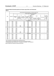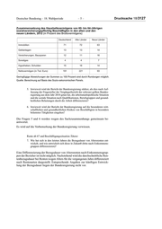 Deutscher Bundestag – 18. Wahlperiode –5– Drucksache 18/3127 Zusammensetzung des Haushaltsvermögens von 60- bis 64-Jährigen sozialversicherungspflichtig Beschäftigten in den alten und den neuen Ländern, 2012 (in Prozent des Bruttovermögens) Deutschland Alte Länder Neue Länder Immobilien 71 72 63 Geldanlagen 13 13 14 Versicherungen, Bausparen 12 11 16 Sonstiges 4 4 7 Hypotheken, Schulden 15 16 14 Nettovermögen (in Tsd. Euro) 191 221 93 Geringfügige Abweichungen der Summen zu 100 Prozent sind durch Rundungen möglich. Quelle: Berechnung auf Basis des Sozio-oekonomischen Panels. 5. Inwieweit wird der Bericht der Bundesregierung stärker, als dies nach Auf- fassung der Fragesteller der Vorgängerbericht der schwarz-gelben Bundes- regierung aus dem Jahr 2010 getan hat, die arbeitsmarktpolitische Situation und die soziale Situation nach Qualifikationen, Berufsgruppen und gesund- heitlichen Belastungen durch die Arbeit differenzieren? 6. Inwieweit wird der Bericht der Bundesregierung auf die besonderen wirt- schaftlichen und gesundheitlichen Risiken von Beschäftigten in besonders belasteten Tätigkeiten eingehen? Die Fragen 5 und 6 werden wegen des Sachzusammenhangs gemeinsam be- antwortet. Es wird auf die Vorbemerkung der Bundesregierung verwiesen. Rente ab 67 und Beschäftigungssituation Älterer 7. Wie hat sich in den letzten Jahren die Bezugsdauer von Altersrenten ent- wickelt, und wie entwickelt sich diese in Zukunft (bitte nach Einkommens- gruppen differenzieren)? Eine Differenzierung der Bezugsdauer von Altersrenten nach Einkommensgrup- pen der Bezieher ist nicht möglich. Nachstehend wird die durchschnittliche Ren- tenbezugsdauer bei Renten wegen Alters für die vergangenen Jahre differenziert nach Rentenarten dargestellt. Entsprechende Angaben zur künftigen Entwick- lung der Bezugsdauer liegen der Bundesregierung nicht vor.