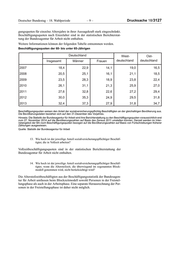 Deutscher Bundestag – 18. Wahlperiode –9– Drucksache 18/3127 gungsquoten für einzelne Altersjahre in ihrer Aussagekraft stark eingeschränkt. Beschäftigungsquoten nach Einzelalter sind in der statistischen Berichterstat- tung der Bundesagentur für Arbeit nicht enthalten. Weitere Informationen können der folgenden Tabelle entnommen werden. Beschäftigungsquoten der 60- bis unter 65-Jährigen Deutschland West- Ost- Insgesamt Männer Frauen deutschland deutschland 2007 18,4 22,9 14,1 19,0 16,5 2008 20,5 25,1 16,1 21,1 18,5 2009 23,5 28,3 18,9 23,8 22,4 2010 26,1 31,1 21,3 25,9 27,0 2011 27,6 32,8 22,6 27,2 29,4 2012 30,0 35,3 24,9 29,5 31,8 2013 32,4 37,3 27,9 31,8 34,7 Beschäftigungsquoten weisen den Anteil der sozialversicherungspflichtig Beschäftigten an der gleichaltrigen Bevölkerung aus. Die Bevölkerungsdaten beziehen sich auf den 31.Dezember des Vorjahres. Hinweis: Die Statistik der Bundesagentur für Arbeit wird ihre Berichterstattung zu den Beschäftigungsquoten voraussichtlich erst zum 27. November 2014 auf die Bevölkerungszahlen auf Basis des Zensus 2011 umstellen können. Derzeit werden im Inter- netangebot der BA noch Beschäftigungsquoten bezogen auf die Bevölkerungszahlen auf Basis von Fortschreibungen früherer Zählungen ausgewiesen. Quelle: Statistik der Bundesagentur für Arbeit 13. Wie hoch ist der jeweilige Anteil sozialversicherungspflichtiger Beschäf- tigter, die in Vollzeit arbeiten? Vollzeitbeschäftigungsquoten sind in der statistischen Berichterstattung der Bundesagentur für Arbeit nicht enthalten. 14. Wie hoch ist der jeweilige Anteil sozialversicherungspflichtiger Beschäf- tigter, wenn die Altersteilzeit, die überwiegend im sogenannten Block- modell genommen wird, nicht berücksichtigt wird? Die Altersteilzeitbeschäftigten aus der Beschäftigungsstatistik der Bundesagen- tur für Arbeit umfassen beim Blockzeitmodell sowohl Personen in der Freistel- lungsphase als auch in der Arbeitsphase. Eine separate Herausrechnung der Per- sonen in der Freistellungsphase ist daher nicht möglich.