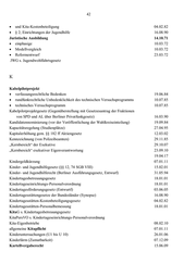 42 und Kita-Kostenbeteiligung § 2; Einrichtungen der Jugendhilfe Juristische Ausbildung einphasige Modellvergleich Reformentwurf JWG s. Jugendwohlfahrtsgesetz 04.02.82 16.08.90 14.10.71 10.03.72 10.03.72 23.03.72 K Kabelpilotprojekt verfassungsrechtliche Bedenken rundfunkrechtliche Unbedenklichkeit des technischen Versuchsprogramms technisches Versuchsprogramm Kabelpilotprojektgesetz (Gegenüberstellung mit Gesetzesantrag der Fraktionen von SPD und AL über Berliner Privatfunkgesetz) Kandidatennominierung (vor der Veröffentlichung der Wahlkreiseinteilung) Kapazitätsregelung (Studienplätze) Kapitalerhöhung gem. §§ 182 ff Aktiengesetz Kennzeichnung (von Polizeibeamten) „Kernbereich“ der Exekutive „Kernbereich“ exekutiver Eigenverantwortung Kindergeldkürzung Kinder- und Jugendhilfegesetz (§§ 12, 74 SGB VIII) Kinder- und Jugendhilferecht (Berliner Ausführungsgesetz, Entwurf) Kindertagesbetreuungsgesetz Kindertageseinrichtungs-Personalverordnung Kindertagesförderungsgesetz (Entwurtf) Kindertagesstättengesetze der Bundesländer (Synopse) Kindertagesstätten-Kostenbeteiligungsgesetz Kindertagesstätten-Personalbemessung KitaG s. Kindertagesbetreuungsgesetz KitaPersVO s. Kindertageseinrichtungs-Personalverordnung Kita-Eigenbetriebe allgemeine Kitapflicht Kinderuntersuchungen (U1 bis U 10) Kinderlärm (Zumutbarkeit) Kartellvergaberecht 19.06.84 10.07.85 10.07.85 16.03.90 19.09.84 27.04.95 12.03.02 29.11.85 29.10.07 23.09.10 19.04.17 07.01.11 15.02.01 31.05.94 18.01.01 18.01.01 03.06.05 16.08.90 04.02.82 18.01.01 08.02.10 07.01.11 26.01.06 07.12.09 15.06.09