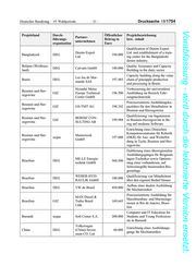 Deutscher Bundestag – 19. Wahlperiode – 21 – Drucksache 19/1754 Vorabfassung - wird durch die lektorierte Version ersetzt. Projektland Durch- Öffentlicher Projektbezeichnung Partner- führungs- Beitrag in bzw. -inhalt unternehmen organisation Euro Qualification of Denim Expert Denim Expert Ltd. and establishment of a train- Bangladesch DEG 194.000 Ltd. ing center for the Bangladeshi denim industry. Belarus (Weißruss- Quality Assurance and Capacity DEG Calvatis GmbH 180.000 land) Building in the dairy sector Capacity building along the value Les Jus de Mar- Benin DEG 197.485 chain of pineapple production mande SAS and processing in Benin. Hyundai Motor Verbesserung der universitären Bosnien und Her- GIZ Europe Technical 196.500 Ausbildung im Bereich Fahr- zegowina Center GmbH zeugmechatronik Praxisorientierte Ausbildungska- Bosnien und Her- GIZ GS-TMT AG 198.242 pazitäten für den Metallsektor in zegowina Bosnien und Herzegowina Qualifizierung von Ingenieuren Bosnien und Her- BERDIZ CON- GIZ 199.988 in Bosnien-Herzegowina in Be- zegowina SULTING AB zug auf moderne Software Einrichtung eines Deutschen Kompetenzzentrums für Robotik Bosnien und Her- Masterwerk sequa 197.000 (DKR) für Aus- und Weiterbil- zegowina GmbH dung in Tuzla, Bosnien und Her- zegowina Etablierung eines überregionalen Ausbildungsganges für Biogasan- ME-LE Energie- lagen-Techniker sowie Optimie- Brasilien DEG 560.500 technik GmbH rung einer vorhandenen, auf Schweinegülle basierenden Bio- gasanlage WEBER-HYD- Qualifizierung von Mitarbeitern Brasilien DEG 100.000 RAULIK GmbH über den eigenen Bedarf hinaus Aufbau einer dualen Ausbildung Brasilien DEG VW do Brasil 450.000 für Mechatroniker Praxisorientierte Ausbildung für MAN Diesel & Maschinenbau- und Marineinge- Brasilien GIZ Turbo Brasil 169.645 nieure in Rio de Janeiro, Brasi- Ltda. lien Computer and IT Education for Burundi sequa Soft Center S.A. 200.000 Students and Young Profession- als in Burundi Volkswagen Einrichtung eines Ausbildungs- China DEG (China) Invest- 60.000 gangs für Mechatroniker ment CO. Ltd