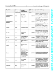 Drucksache 19/1754 – 24 – Deutscher Bundestag – 19. Wahlperiode Vorabfassung - wird durch die lektorierte Version ersetzt. Projektland Durch- Öffentlicher Projektbezeichnung Partner- führungs- Beitrag in bzw. -inhalt unternehmen organisation Euro Schaffung einer inklusiven Lie- Eurofresh ferkette für Süßkartoffel-Varian- Dominikanische DEG Vegetales y 193.600 ten und Training von Kleinbäue- Republik Frutas S.L. rInnen in guter landwirtschaftli- cher Praxis. Verbesserung der Qualifikation von Näherinnen und Führungs- Dominikanische DEG Eurostil S.R.L. 195.500 kräften und Einführung neuer Republik Produktionsmethoden in der Be- kleidungsindustrie. Qualifizierung von Nachhaltig- keitsmanagern zur nachhaltigen Ecuador sequa comundus GmbH 180.000 Tourismusentwicklung in Ecua- dor. Capacity Building für Qualitäts- sicherung und die internationale Blütenpracht Ecuador sequa 195.000 Vermarktung von Schnittblumen GmbH durch kleine und mittelgroße Pro- duzenten in Ecuador. Fickert & Winter- Verwertung organischer Abfälle Ecuador sequa ling Maschinen- 192.000 durch Biogastechnologie – Kom- bau GmbH petenzentwicklung in Ecuador Knauf Gips Tbi- Aufbau des Schulungszentrums Georgien DEG 172.000 lisi Knauf Gips in Tiflis Nachhaltige Produktion von Fut- termais und Ölsaaten durch Aus- Demmel Sixtus Ghana DEG 192.949 bildung von Kleinbauern und AG Aufbau genossenschaftlicher Strukturen in der Ashanti Region CNH Industrial Österreich GmbH CASE ICH Integrated Water Kompetenzentwicklung zu land- Ghana GIZ 500.000 Management & wirtschaftlichen Techonlogien. Agricultural De- velopment Ghana Ltd (IWAD) Berufsbildung für Solartechnolo- DCH Energy gien, um dezentrale Netzlösun- Ghana sequa 200.000 GmbH gen in ländlichen Gebieten Gha- nas zur Verfügung zu stellen. Etablierung einer geschlossenen Lieferkette für FLO-zertifizierte, ECO TERRA Guatemala DEG 199.800 organisch angebaute Macadamia- GmbH Nüsse sowie Qualifizierung von Kleinbauern.