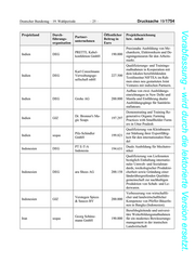 Deutscher Bundestag – 19. Wahlperiode – 25 – Drucksache 19/1754 Vorabfassung - wird durch die lektorierte Version ersetzt. Projektland Durch- Öffentlicher Projektbezeichnung Partner- führungs- Beitrag in bzw. -inhalt unternehmen organisation Euro Praxisnahe Ausbildung von Me- PRETTL Kabel- chanikern, Elektronikern und De- Indien DEG 190.000 konfektion GmbH signingenieuren für den Arbeits- markt. Qualifizierungs- und Trainings- maßnahmen in Kooperation mit Karl Conzelmann dem lokalen berufsbildenden Indien DEG Verwaltungsge- 227.500 Textilinstitut NIFTEA im Rah- sellschaft mbH men eines neu gestarteten Joint Ventures mit indischen Partnern. Aufbau von zwei Ausbildungs- einrichtungen in New Delhi und Indien DEG Grohe AG 200.000 Manila und Einführung dualer Ausbildungsgänge für Sanitärin- stallateure. Demonstrating and Training Re- Dr. Bronner's Ma- generative Organic Farming Indien GIZ 197.297 gic Soaps Practices with Smallholder Farm- ers in Uttar Pradesh Qualifizierung von Kleinbauern Pilz-Schindler zur Stärkung ihrer Exportfähig- Indien sequa 199.821 GmbH keit für den internationalen Han- del PT E-T-A Duale Ausbildung für Mechatro- Indonesien DEG 194.631 Indonesia niker Qualifizierung von Lieferanten bezüglich Einhaltung internatio- naler Umwelt- und Sozialstan- dards, toxikologischer Produktsi- Indonesien DEG ara Shoes AG 200.158 cherheit sowie Gründung einer länderübergreifenden Qualitäts- gemeinschaft zur nachhaltigen Produktion von Schuh- und Le- derwaren. Verbesserung von wirtschaftli- Verstegen Spices cher und landwirtschaftlicher Indonesien GIZ 200.000 & Sauces BV Kompetenz von Pfeffer-BäuerIn- nen in Bangka (Indonesien). Berufsbegleitende und universi- täre Weiterbildungsmaßnahmen Georg Schüne- Iran sequa 190.000 für ein modernes Bewässerungs- mann GmbH management in der iranischen Landwirtschaft