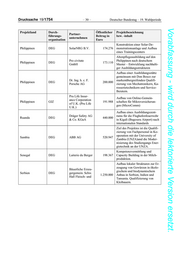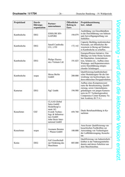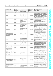 Drucksache 19/1754 – 26 – Deutscher Bundestag – 19. Wahlperiode Vorabfassung - wird durch die lektorierte Version ersetzt. Projektland Durch- Öffentlicher Projektbezeichnung Partner- führungs- Beitrag in bzw. -inhalt unternehmen organisation Euro Ausbildung von Einzelhändlern ESSILOR SIN- in der Durchführung von Sehtests Kambodscha DEG 194.079 GAPORE und Zurverfügungstellung von Sehhilfen Capacity Building medizinischen Sanofi Cambodia Personals, um öffentliches Be- Kambodscha DEG 172.142 CO., LTD wusstsein in Bezug auf Diabetes in Kambodscha zu schaffen. Energieeffizienz-Initiative: Ein- führung von Solar Home Systems bei Haushalten, Gemeindezen- Philips Electro- Kambodscha DEG 191.025 tren, Schulen etc., Aufbau eines nics Vietnam Ltd. Wartungs- und Reparaturcenters sowie Durchführung entspre- chender Schulungen. Qualifizierung kambodschani- Messe Berlin scher Modedesigner für die Ent- Kambodscha sequa 200.000 GmbH wicklung von hochwertigen, mo- dern-ethnischen Designprodukten Aufbau eines Kompetenzzent- rums für Berufseinstieg, Qualifi- zierung, sowie Unternehmens- Kamerun DEG NgC Gmbh 194.988 gründungen von jungen Kameru- nern im IT/ Technologiesektor Competence Center Kamany Ta- lent Academy (K.T.A.) CLAAS Global Sales GmbH HeidelbergCe- ment AG Duale Berufsausbildung in Ka- Kasachstan GIZ Evonik Techno- 458.760 sachstan logy & Infrastruc- ture GmbH John Deere Inter- national GmbH Area-Scout: Qualifizierung von kasachischen Fachkräften zur Assmann Beraten Kasachstan sequa 180.000 Anwendung von Technologien + Planen GmbH der Luftbilderzeugung, Kasachs- tan Qualifizierung von Industriefach- GzF Gesellschaft kräften in der Nahrungsmittelin- Kenia DEG zur Förderung des 805.000 dustrie und deren Zulieferer aus Maschinen dem Maschinenbau.