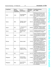 Drucksache 19/1754 – 30 – Deutscher Bundestag – 19. Wahlperiode Vorabfassung - wird durch die lektorierte Version ersetzt. Projektland Durch- Öffentlicher Projektbezeichnung Partner- führungs- Beitrag in bzw. -inhalt unternehmen organisation Euro Konstruktion einer Solar-De- Philippinen DEG SolarNRG B.V. 174.276 monstrationsanlage und Aufbau eines Trainingscenters Altenpflegeausbildung auf den Pro civitate Philippinen nach deutschem Philippinen DEG 173.110 GmbH Muster – Entwicklung nachhalti- ger Ausbildungsstrukturen Aufbau einer Ausbildungsstätte gemeinsam mit Don Bosco zur Dr. Ing. h. c. F. markenübergreifenden Qualifi- Philippinen DEG 200.000 Porsche AG zierung von Mechatronikern, Ka- rosserietechnikern und Service- Beratern. Pru Life Insur- Aufbau von Online-Gemein- ance Corporation Philippinen GIZ 191.988 schaften für Mikroversicherun- of U.K. (Pru Life gen (MicroComm) U.K.) Aufbau eines Ausbildungszent- Dräger Safety AG rums für die Flughafenfeuerwehr Ruanda DEG 440.000 & Co. KGaA in Kigali (Bugesera Airport) nach internationalen Standards Ziel des Projektes ist die Qualifi- zierung von Fachpersonal in Ko- operation mit der University of Sambia DEG ABB AG 520.947 Zambia (UNZA)und die Moder- nisierung des Studiengangs Ener- gietechnik an der UNZA. Kompetenzvermittlung und Senegal DEG Laiterie du Berger 198.367 Capacity Building in der Milch- produktion. Aufbau lokaler Strukturen zur Er- zeugung von Gewürzen in ökolo- Bäuerliche Erzeu- gischem und biodynamischem Serbien DEG gergemein. Schw. 1.250.000 Anbau in Serbien, Indien und Hall Fleisch- und Tansania. Qualifizierung von Kleibauern.
