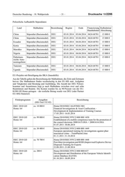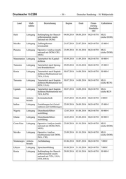 Drucksache 18/2286 – 30 – Deutscher Bundestag – 18. Wahlperiode Land Maß- Bezeichnung Beginn Ende Finan- Kalkulation nahme zierung Haushalts- titel Haiti Lehrgang Bekämpfung der Rausch- 04.08.2014 08.08.2014 0624 68701 MLG giftkriminalität (multi- (siehe DOM) national mit DOM) Mexiko Lehrgang Zahlungskarten- 21.07.2014 25.07.2014 0624 68701 15 000 € kriminalität Panama Lehrgang Operative Analyse (multi- 23.09.2014 01.10.2014 0624 68701 MLG national mit DOM, CRI, (siehe DOM) MEX) Mauretanien Lehrgang Tatortarbeit bei Kapital- 03.09.2014 11.09.2014 0624 68701 10 000 € delikten Tunesien Lehrgang Tatortarbeit nach Spreng- 29.09.2014 10.10.2014 0624 68701 15 000 € und Branddelikten Kenia Lehrgang Tatortarbeit nach Kapital- 30.07.2014 14.08.2014 0624 68701 30 000 € delikten (Multinational mit TZA, UGA) Tansania Lehrgang Tatortarbeit nach Kapital- 30.07.2014 14.08.2014 0624 68701 MLG delikten (Multinational mit (siehe KEN) KEN, UGA) Uganda Lehrgang Tatortarbeit nach Kapital- 30.07.2014 14.08.2014 0624 68701 MLG delikten (Multinational mit (siehe KEN TZA, KEN) Oman Arbeits- Kriminaltechnik 13.07.2014 04.10.2014 0624 68701 6 000 € besuch Indien Lehrgang Ermittlungen bei Geisel- 22.09.2014 26.09.2014 0624 68701 15 000 € nahmen und Entführungen Nigeria Lehrgang Diensthundeführer- 12.05.2014 01.08.2014 0624 68701 30 000 € ausbildung Ghana Lehrgang Diensthundeführer- 12.05.2014 01.08.2014 0624 68701 30 000 € ausbildung Costa Rica Lehrgang Operative Analyse (multi- 23.09.2014 01.10.2014 0624 68701 MLG national mit DOM, PAN, (siehe DOM) MEX) Mexiko Lehrgang Operative Analyse 23.09.2014 01.10.2014 0624 68701 MLG (multinational mit DOM, (siehe DOM) PAN, CRI) Montenegro Arbeits- Zielfahndung 01.06.2014 30.07.2014 0624 68701 7 000 € besuch Libyen Lehrgang Sprachausbildung 01.08.2014 31.10.2014 0624 68701 7 000 € Kenia Lehrgang Bekämpfung der Rausch- 29.09.2014 02.10.2014 0624 68701 30 000 € giftkriminalität (multi- national mit TZA, UGA, ETH, RWA)