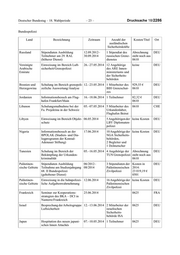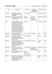 Drucksache 18/2286 – 24 – Deutscher Bundestag – 18. Wahlperiode Land Bezeichnung Zeitraum Anzahl der Kosten/Titel Ort ausländischen Sicherheitskräfte Slowakei Schulung im Bereich der 02.–06.06.2014 keine Kosten SVK Bekämpfung der Urkunden- kriminalität Turkmenistan Einweisung in den Organisa- 30.06.– 4 Vertreter keine Kosten DEU tion und den Ablauf am Flug- 02.07.2014 turkmenischer hafen München Behörden, 2 Vertreter OSZE USA Informationsbesuch von US 08.05.2014 keine Kosten DEU Rettungsassistenten im Rah- men des Programms „Viginia Association of Volunteer Rescue Squads, German Para- medic Exchange Program“ bei der BPOLI Kassel und dem Flugdienst der Bundespolizei, Einweisung in Bahnpolizei/ Grenzpolizei sowie des Flug- dienstes der Bundespolizei Bulgarien Arbeitspartnerschaft, 12.–23.05.2014 3 Teilnehmer 0625 DEU Hospitation Ermittlungsdienst Bulgarien Arbeitspartnerschaft; 23.–27.06.2014 0625 BGR Hospitation zur Optimierung der Arbeitsabläufe einer Kon- taktdienststelle Bulgarien Arbeitspartnerschaft der Flug- 01.–06.06.2014 7 Teilnehmer 110,93 € DEU häfen Frankfurt/Main und 0625 München mit Flughafen Sofia, Einweisung in die grenz-/poli- zeiliche Aufgabenwahr- nehmung Bulgarien Praktikum bei BPOLI RO, 18.–30.05.2014 5 Angehöriger keine Kosten DEU Grenz-/polizeiliche Aufgaben der Regional- Gruppenleiter direktion Smolyan Bulgarien Organisationsuntersuchung der 31.03.– 0625 BGR BGR Grenzpolizei 04.04.2014 und 12.–16.05.2014 Kroatien Regionalseminar illegale Immi- 14.–16.04.2014 393,97 € HRV gration „Fight Against Illegal 0625 Immigration Networks in Southeast Europe“ in Zagreb/ Kroatien in Zagreb